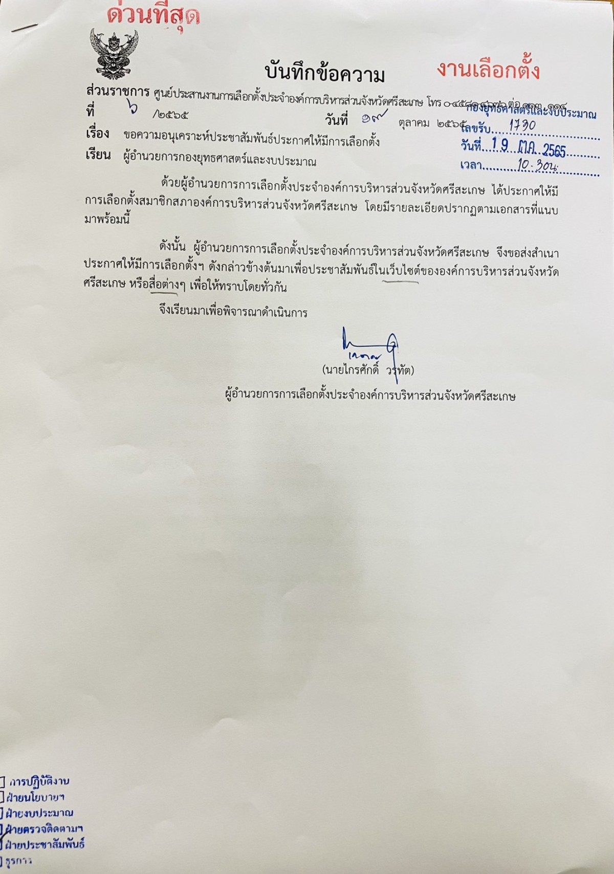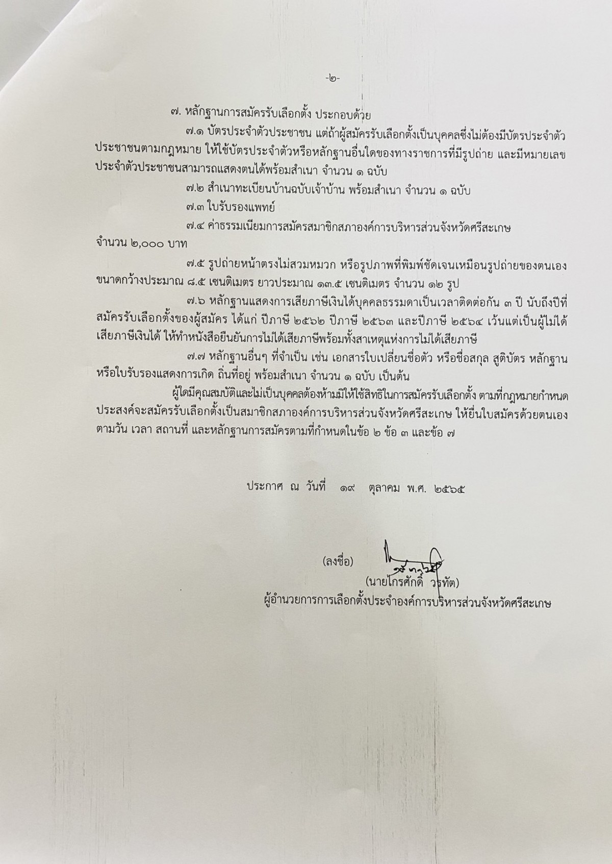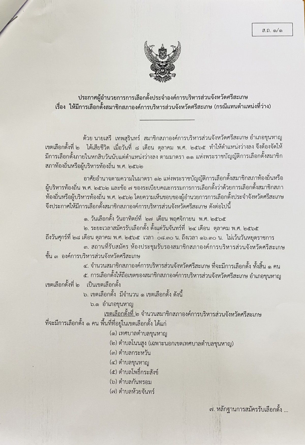ประกาศผู้อำนวยการการเลือกตั้งประจำองค์การบริหารส่วนจังหวัดศรีสะเกษ เรื่อง ให้มีการเลือกตั้งสมาชิกสภาองค์การบริหารส่วนจังหวัดศรีสะเกษ (กรณีแทนตำแหน่งที่ว่าง)