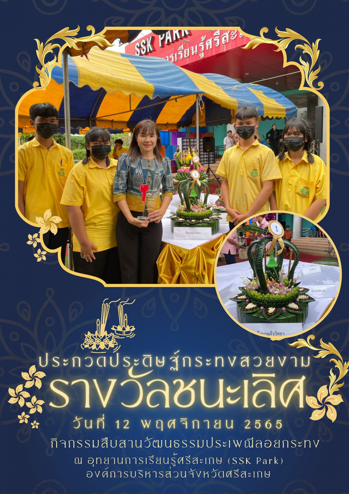กับนักเรียนและคุณครูผู้ฝึกสอน กิจกรรมสืบสานวัฒนธรรมประเพณีลอยกระทง "การประกวดประดิษฐ์กระทงสวยงาม" จัดโดยองค์การบริหารส่วนจังหวัดศรีสะเกษ ณ อุทยานการเรียนรู้ (SSK Park)