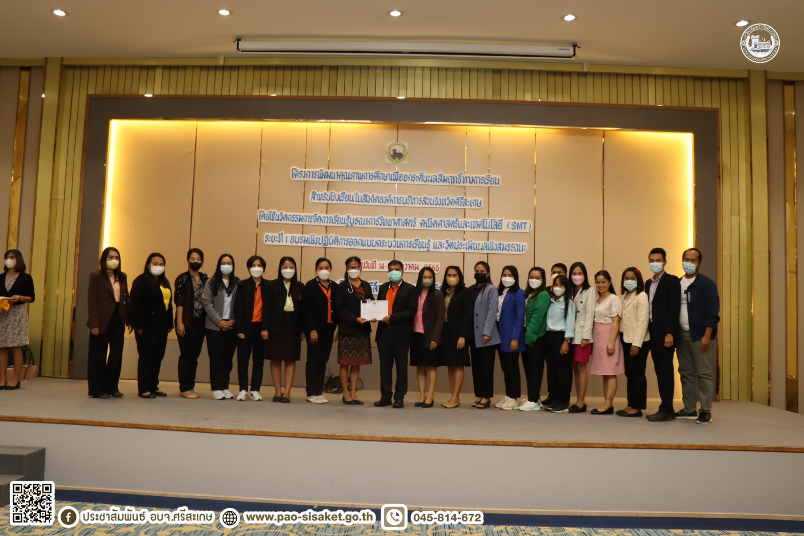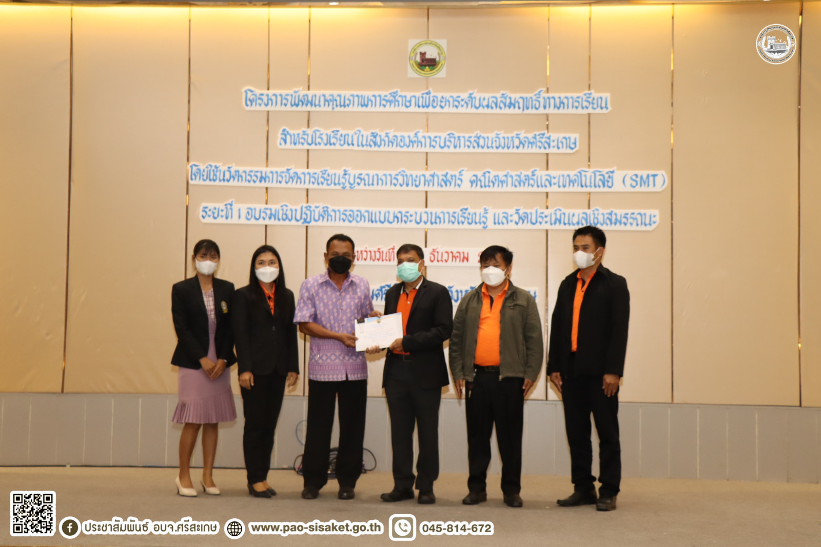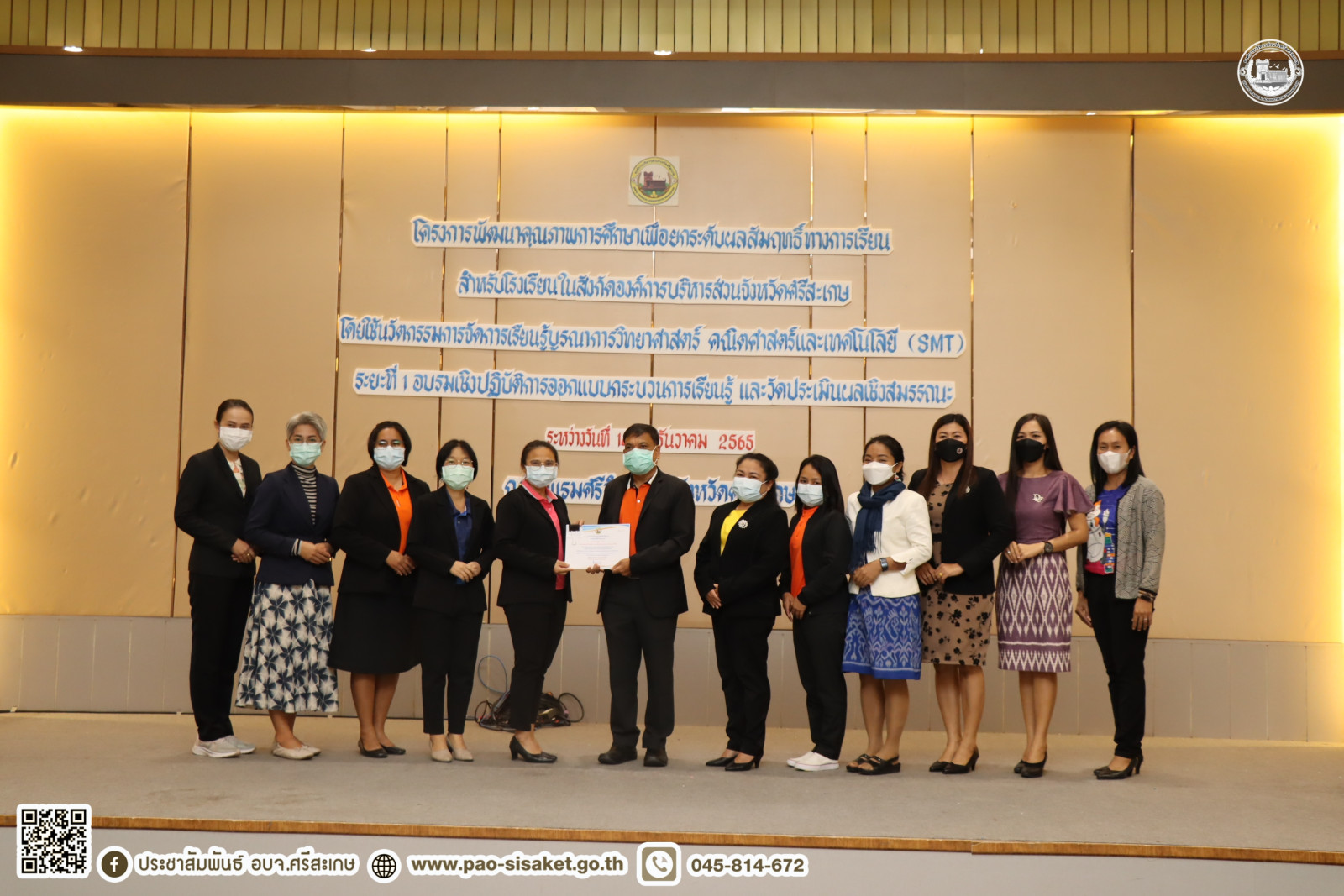 อบจ.ศรีสะเกษ ปิดโครงการพัฒนาคุณภาพการศึกษาเพื่อยกระดับผลสัมฤทธิ์ทางการเรียนสำหรับโรงเรียนในสังกัดองค์การบริหารส่วนจังหวัดศรีสะเกษโดยใช้นวัตกรรมการจัดการเรียนรู้บูรณาการวิทยาศาสตร์ คณิตศาสตร์และเทคโนโลยี (SMT) ระยะที่ ๑ อบรมเชิงปฏิบัติการออกแบบกระบวนการเรียนรู้ และวัดประเมินผลเชิงสมรรถนะ