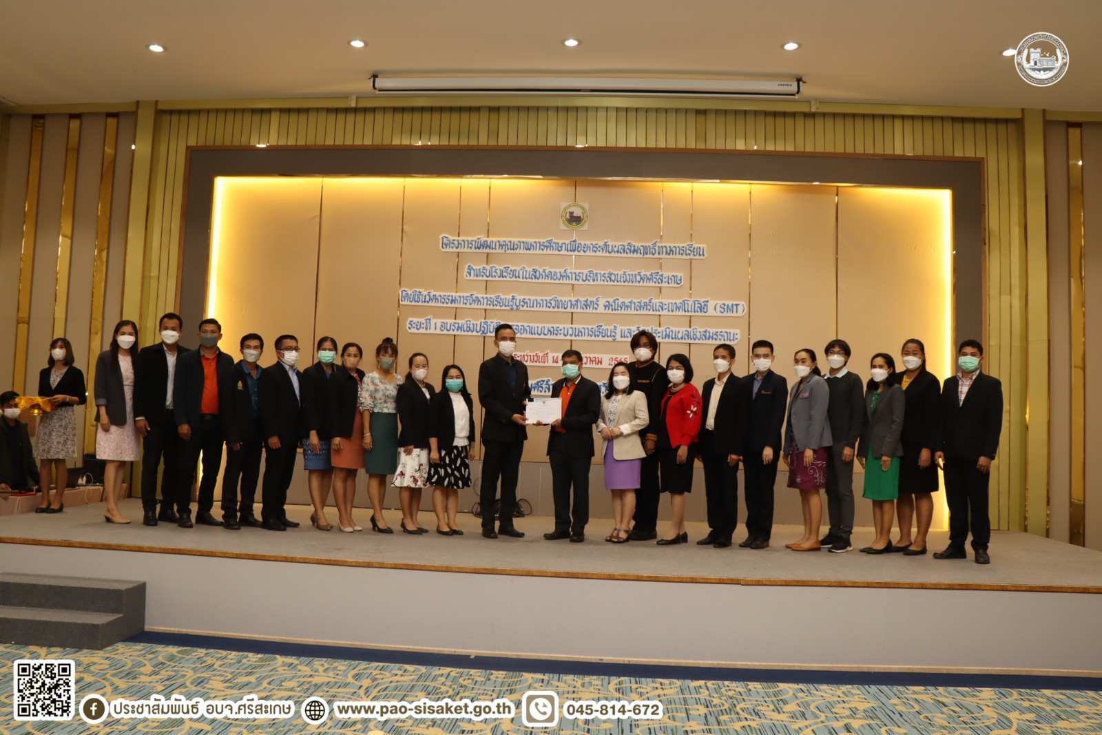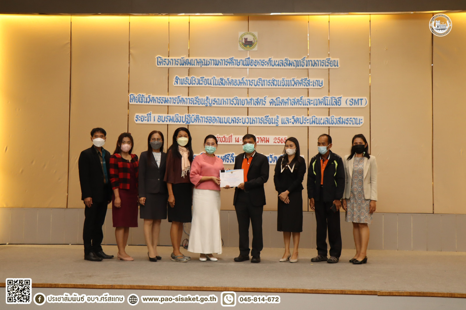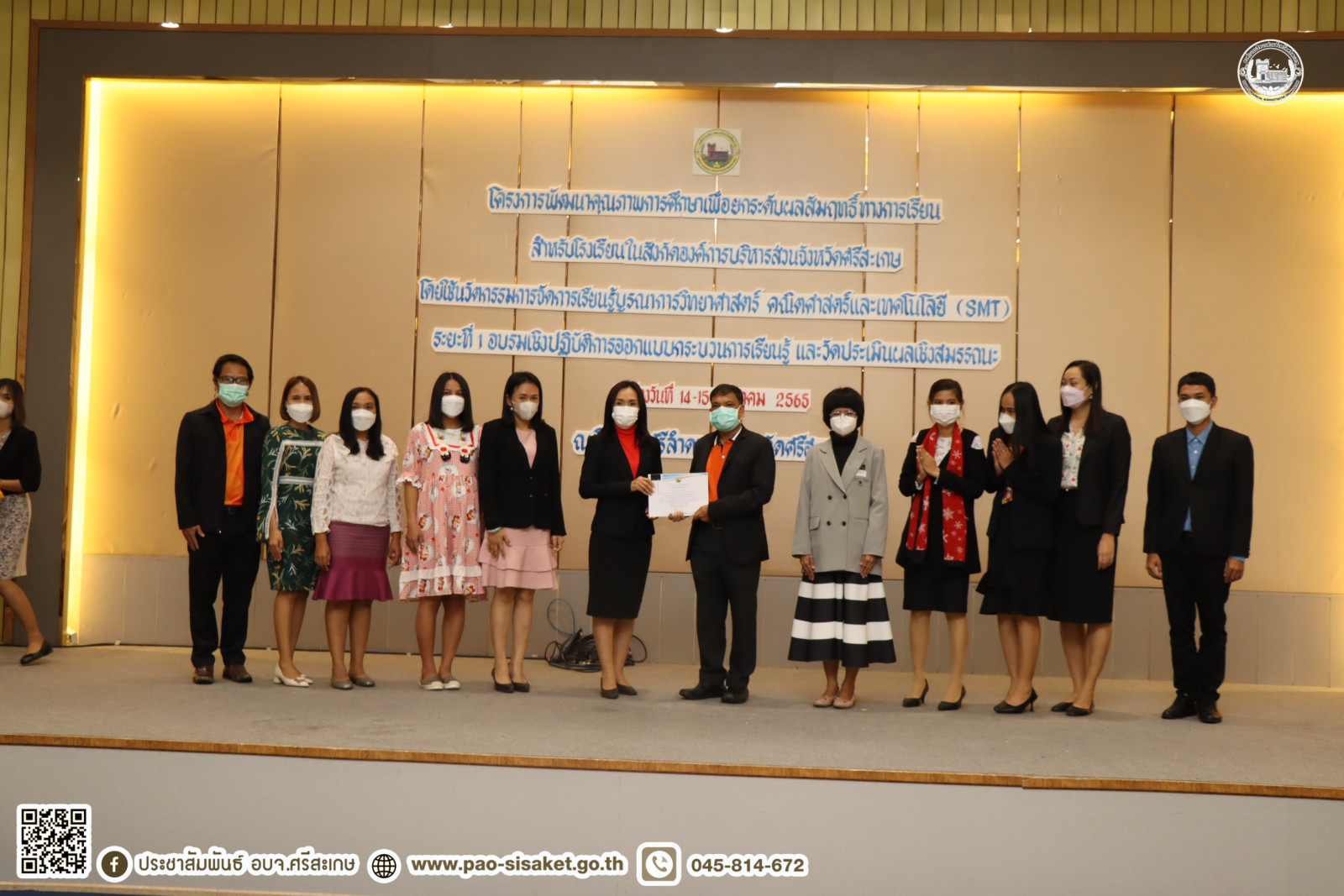 อบจ.ศรีสะเกษ ปิดโครงการพัฒนาคุณภาพการศึกษาเพื่อยกระดับผลสัมฤทธิ์ทางการเรียนสำหรับโรงเรียนในสังกัดองค์การบริหารส่วนจังหวัดศรีสะเกษโดยใช้นวัตกรรมการจัดการเรียนรู้บูรณาการวิทยาศาสตร์ คณิตศาสตร์และเทคโนโลยี (SMT) ระยะที่ ๑ อบรมเชิงปฏิบัติการออกแบบกระบวนการเรียนรู้ และวัดประเมินผลเชิงสมรรถนะ