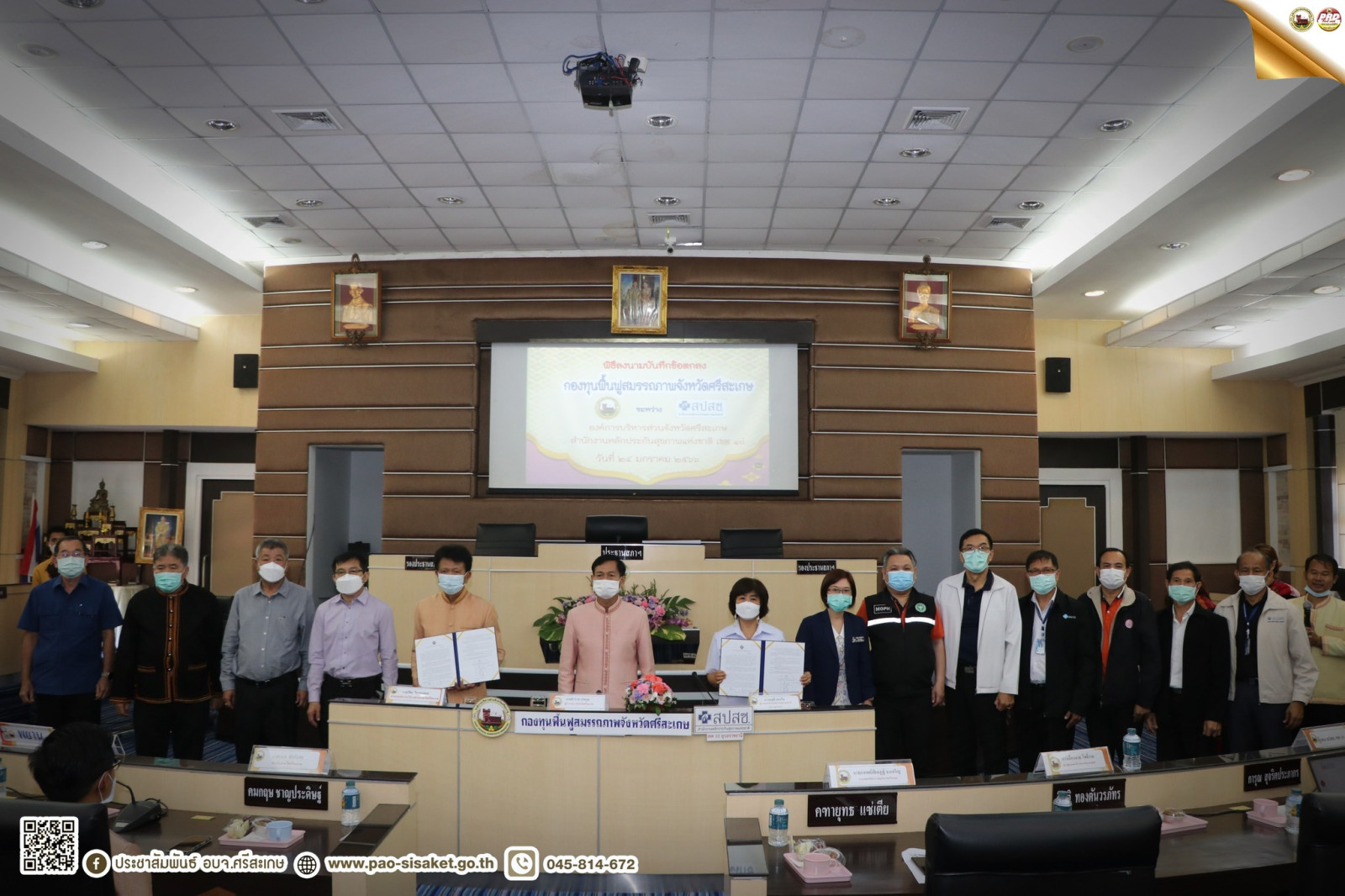 วันที่ ๒๔ มกราคม ๒๕๖๖ เวลา ๑๑.๓๐ น. ณ ห้องประชุมสภาองค์การบริหารส่วนจังหวัดศรีสะเกษ นายสำรวย เกษกุล ผู้ว่าราชการจังหวัดศรีสะเกษ เป็นประธานในพิธีลงนามบันทึกข้อตกลงจัดตั้งกองทุนฟื้นฟูสมรรถภาพจังหวัดศรีสะเกษระหว่าง องค์การบริหารส่วนจังหวัดศรีสะเกษ นายวิชิต ไตรสรณกุล นายกองค์การบริหารส่วนจังหวัดศรีสะเกษ นางมลุลี แสนใจ ผู้อำนวยการสำนักงานหลักประกันสุขภาพแห่งชาติ เขต ๑๐ อุบลราชธานี รองนายกองค์การบริหารส่วนจังหวัดศรีสะเกษ คณะผู้บริหาร หัวหน้าส่วนราชการองค์การบริหารส่วนจังหวัดศรีสะเกษ ผู้อำนวยโรงพยาบาลส่งเสริมสุขภาพตำบล และแขกผู้มีเกียรติ ร่วมพิธีลงนามในครั้งนี้