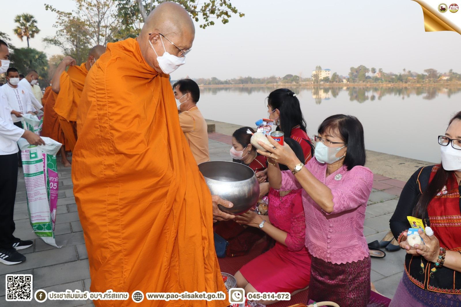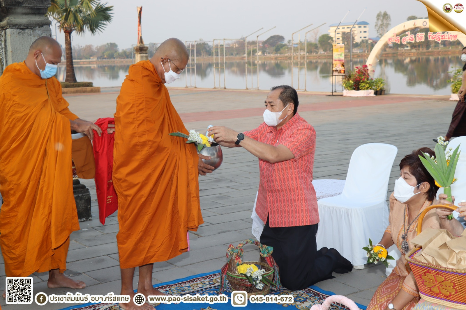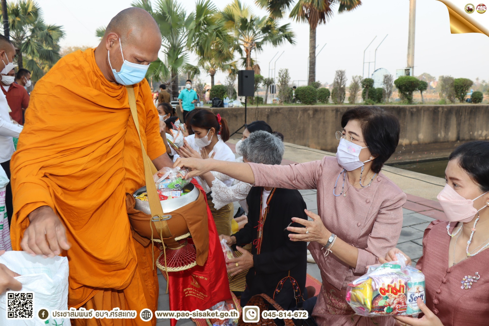 โดยผู้เข้าร่วมกิจกรรมได้ร่วมพิธีทำบุญตักบาตรพระสงฆ์จำนวน ๙ รูป ทั้งนี้กิจกรรมดังกล่าว จัดขึ้นเพื่อส่งเสริมให้ผู้เข้าร่วมกิจกรรมแต่งกายด้วยผ้าไทยและผ้าพื้นเมือง และการแสดงศิลปวัฒนธรรม จังหวัดศรีสะเกษ รวมทั้งใช้วัสดุจากธรรมชาติ ซึ่งภายในกิจกรรมได้มีการจัดจำหน่ายสินค้าอาหารและ OTOP จังหวัดศรีสะเกษ จากกลุ่มผู้ประกอบการประกอบด้วย กลุ่มผู้ผลิตผ้าแส่ว ผ้าทอมือ ผ้าพื้นเมือง อาหารพื้นถิ่น และการแสดงศิลปวัฒนธรรมพื้นถิ่น เพื่อสนับสนุนและส่งเสริมการใช้จ่ายและการกระตุ้นเศรษฐกิจ กระจายรายได้ ลดความเหลื่อมล้ำ เสริมสร้างความเข้มแข็ง และเจริญเติบโตของเศรษฐกิจฐานราก
