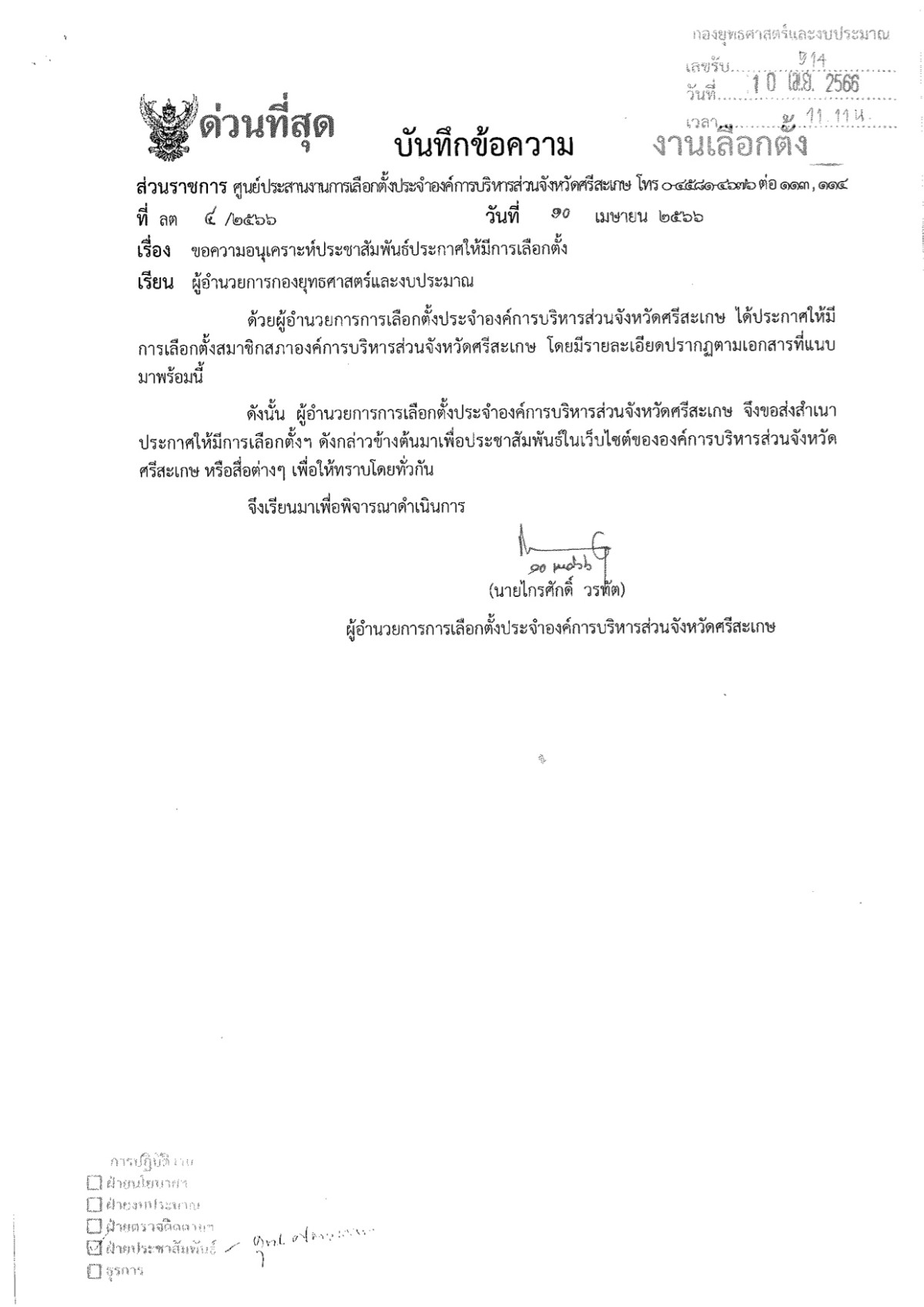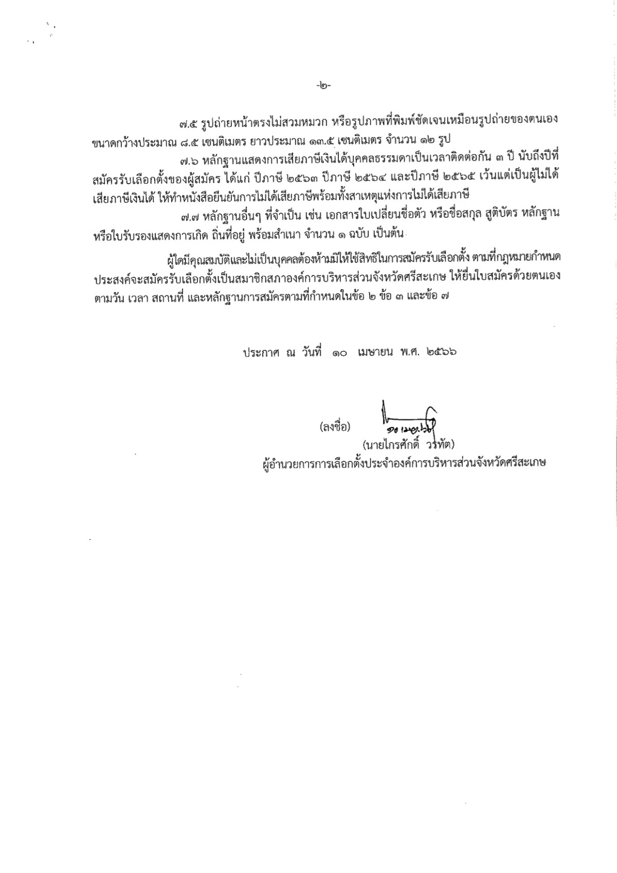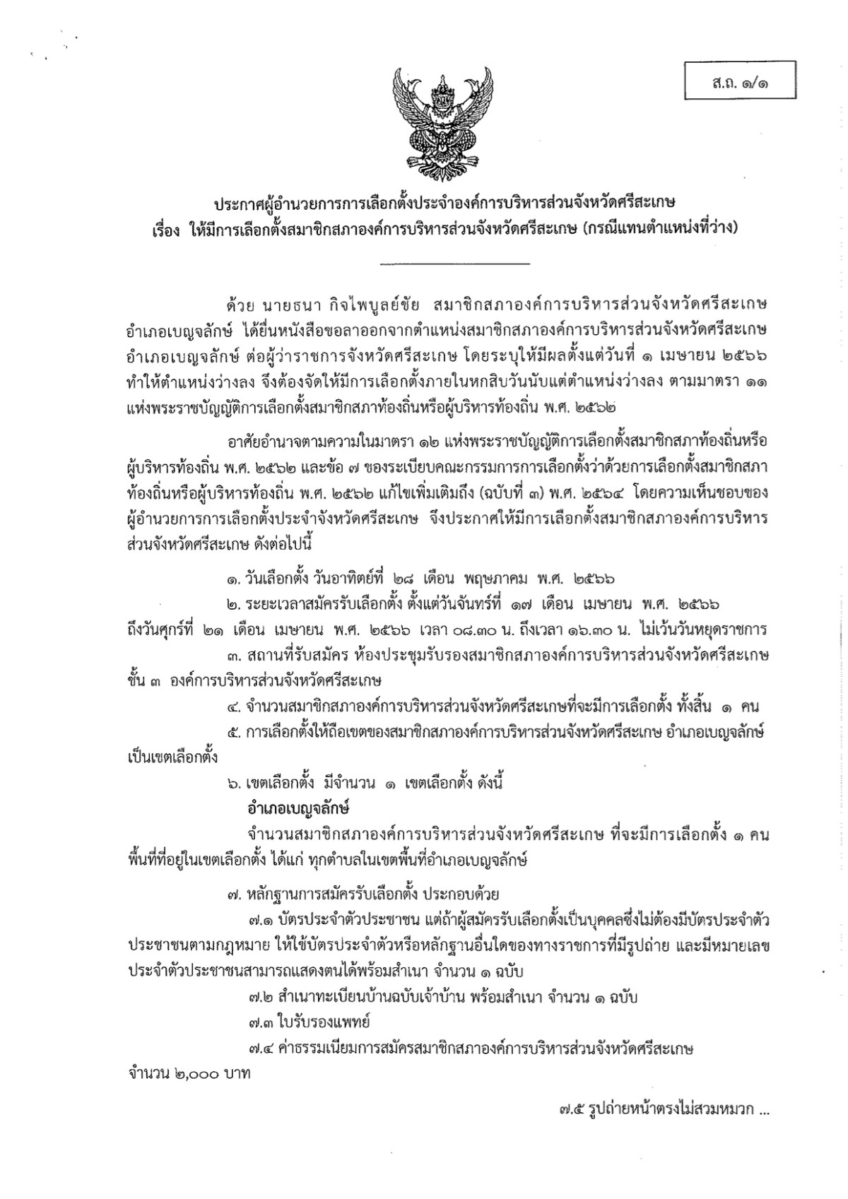 ประกาศผู้อำนวยการการเลือกตั้งประจำองค์การบริหารส่วนจังหวัดศรีสะเกษ เรื่อง ให้มีการเลือกตั้งสมาชิกสภาองค์การบริหารส่วนจังหวัดศรีสะเกษ (กรณีแทนตำแหน่งที่ว่าง)