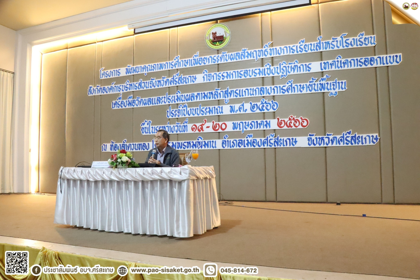 นายไกรศักดิ์ วรทัต ปลัดองค์การบริหารส่วนจังหวัดศรีสะเกษ กล่าวว่า ในปัจจุบันปัญหาของการดำเนินการออกแบบแผนการจัดการเรียนรู้ตามมาตรฐานการเรียนรู้ของหลักสูตรแกนกลางการศึกษาชั้นพื้นฐาน ประกอบกับการรายงานผลการนิเทศงานวิชาการของโรงเรียนในสังกัดองค์การบริหารส่วนจังหวัดศรีสะเกษ ในภาคเรียนที่ ๒ ปีการศึกษา ๒๕๖๕ เป็นไปในทิศทางเดียวกันว่าครูยังขาดความรู้ความเข้าใจที่ไม่ชัดเจนเกี่ยวกับการกำหนดกรอบการประเมินผลการเรียนรู้ การเลือกใช้เครื่องมือการประเมินผลที่สอดคล้องกับธรรมชาติของวิชา ซึ่งเป็นประเด็นสำคัญที่จะใช้ในการดำเนินตัดสินผลการเรียนของผู้เรียนและทำให้ผู้เรียนได้รับการพัฒนาในการเรียนรู้เพิ่มขึ้นเพื่อให้การดำเนินงานของครูทุกกลุ่มสาระการเรียนรู้ของสถานศึกษาในสังกัดองค์การบริหารส่วนจังหวัดศรีสะเกษเกิดองค์ความรู้และเป็นการสร้างความรู้ความเข้าใจในการออกแบบเครื่องมือวัดผลและประเมินผลการกำหนดเกณฑ์การประเมิน การระบุเกณฑ์การประเมินที่สอดคล้องกับมาตรฐานการเรียนรู้และตัวชี้วัด กลุ่มงานวัดผลและประเมินการศึกษา กองการศึกษา ศาสนาและวัฒนธรรม ในบทบาทของผู้รับผิดชอบการพัฒนาความรู้ความเข้าใจของครูในการออกกแบบการใช้เครื่องมือการวัดผลและประเมินผล จึงได้จัดโครงการการอบรมเชิงปฏิบัติการ เทคนิคการออกแบบเครื่องมือวัดผลและประเมินผลตามหลักสูตรแกนกลางการศึกษาขั้นพื้นฐาน ประจำปีงบประมาณ พ.ศ. ๒๕๖๖ ขึ้น ในระหว่างวันที่ ๑๙ – ๒๐ พฤษภาคม พ.ศ. ๒๕๖๖ ณ ห้องประชุมลำดวนทอง โรงแรมพรหมพิมานอำเภอเมืองศรีสะเกษ จังหวัดศรีสะเกษ ในการจัดอบรมในครั้งนี้มีวัตถุประสงค์ ดังนี้๑) เพื่อสร้างความรู้ความเข้าใจเกี่ยวกับการออกแบบเครื่องมือวัดผลและประเมินผล๒) เพื่อให้ครูและบุคลากรทางการศึกษาสามารถออกแบบเครื่องมือวัดผลและประเมินผลตามหลักสูตรแกนกลางการศึกษาขั้นพื้นฐานได้ทั้งนี้มีจำนวนผู้เข้าอบรมทั้งสิ้น ๑๘๐ คน โดยการจัดกิจกรรมในครั้งนี้ ได้รับการสนับสนุนจากองค์การบริหารส่วนจังหวัดศรีสะเกษ และได้รับเกียรติจากท่าน รศ.ดร.ทรงศักดิ์ ภูสีอ่อน รองคณบดีฝ่ายวิชาการ คณะศึกษาศาสตร์ มหาวิทยาลัยมหาสารคาม ให้เกียรติเป็นวิทยากรตลอดการอบรมทั้ง ๒ วัน