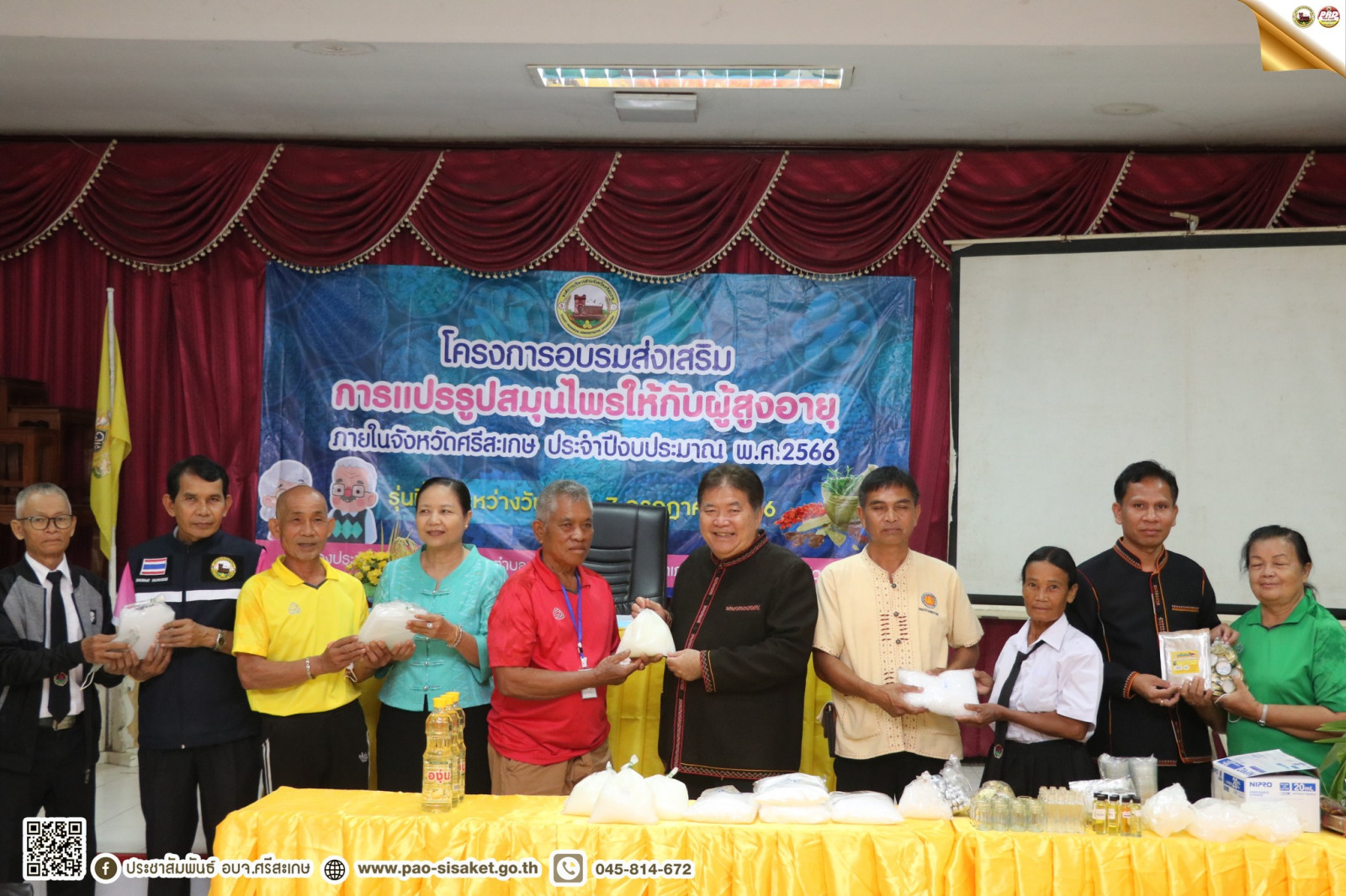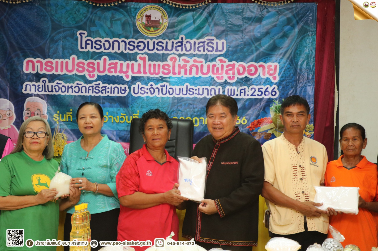 นายวิชิต ไตรสรณกุล นายกองค์การบริหารส่วนจังหวัดศรีสะเกษ มอบหมายให้ นายอภิศักดิ์ แซ่จึง รองนายกองค์การบริหารส่วนจังหวัดศรีสะเกษ เป็นประธาน โครงการอบรมส่งเสริมการแปรรูปสมุนไพรให้กับผู้สูงอายุ ภายในจังหวัดศรีสะเกษ ประจำปีงบประมาณ พ.ศ.2566 รุ่นที่ 3 ระหว่างวันที่ 4-7 กรกฎาคม 2566 มีผู้สูงอายุเข้ารวมอบรมจำนวน 25 คน ในวันที่ 4 กรกฎาคม 2566 ณ ห้องประชุมองค์การบริหารส่วนตำบลหนองห้าง อำเภออุทุมพรพิสัย จังหวัดศรีสะเกษ