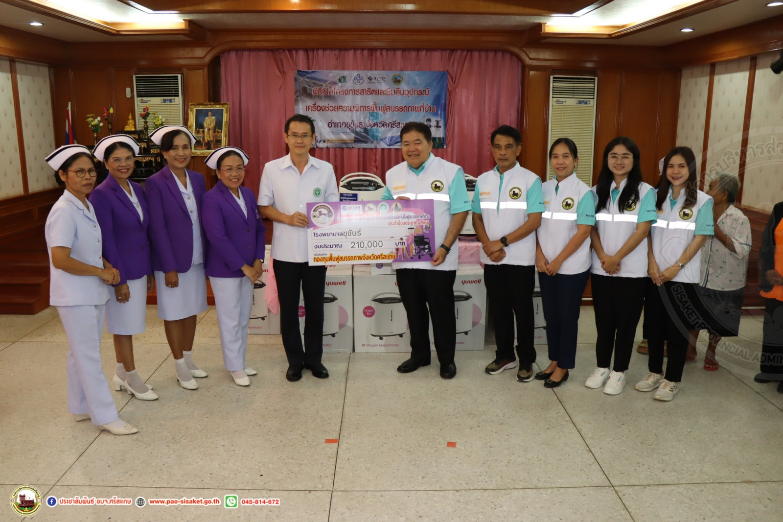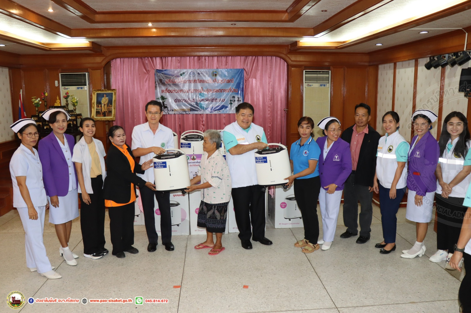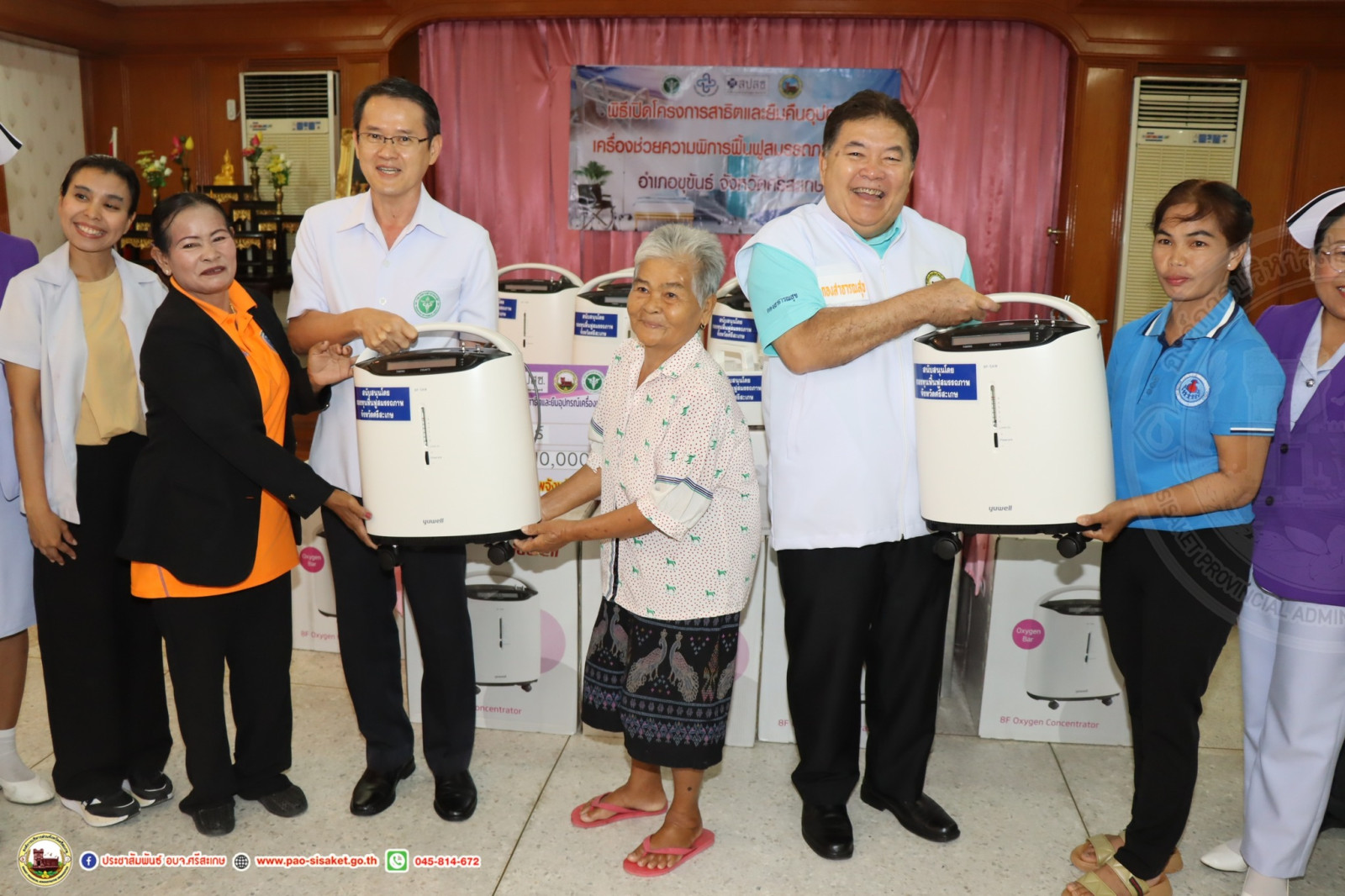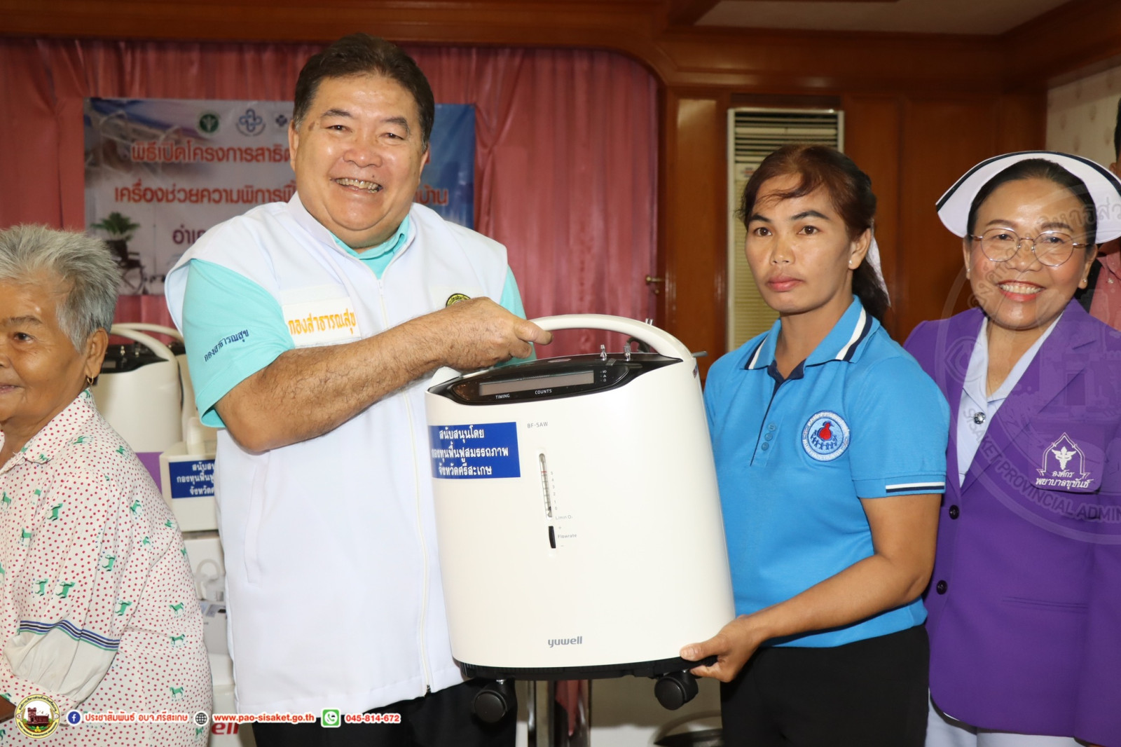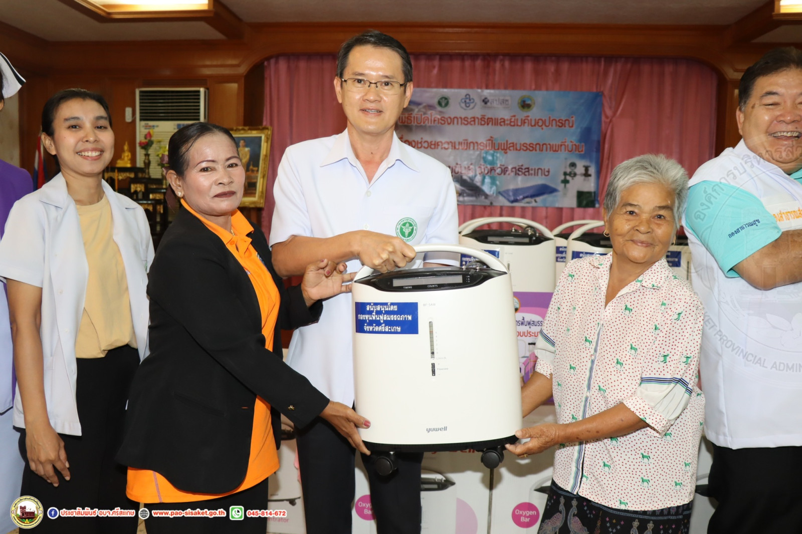 นายอภิศักดิ์ แซ่จึง รองนายกองค์การบริหารส่วนจังหวัดศรีสะเกษ กล่าวว่า โครงการศูนย์สาธิตและยืมอุปกรณ์เครื่องช่วยความพิการฟื้นฟูสมรรถภภาพที่บ้าน ประจำปีงบประมาณ ๒๕๖๖ มีวัตถุประสงค์เพื่อให้บริการและยืมคืนอุปกรณ์เครื่องช่วยความพิการกับกลุ่มเป้าหมาย คือ ผู้พิการ ผู้สูงอายุ ผู้ป่วยที่มีภาวะพึ่งพิง และผู้ป่วยที่อยู่ในระยะเฉียบพลัน ให้สามารถใช้พื้นฟูสมรรถภาพต่อเนื่องที่บ้านได้และลดภาระค่าใช้จ่ายของครอบครัวผู้ป่วย โดยกองทุนฟื้นฟูสมรรถภาพจังหวัดศรีสะเกษ ได้สนับสนุนงบประมาณ จำนวน ๒๑๐,๐๐๐ บาท เพื่อเป็นค่าจ่ายใช้ในการดำเนินงานตามโครงการ และได้ดำเนินการจัดหาเครื่องผลิตออกซิเจน จำนวน ๕ ลิตร และเครื่องดูดเสมหะจำนวน ๑ เครื่อง และทางโรงพยาบาลขุขันธ์จะได้ดำไปให้กลุ่มผู้ป่วยที่มีความจำเป็นต้องใช้ต่อไป