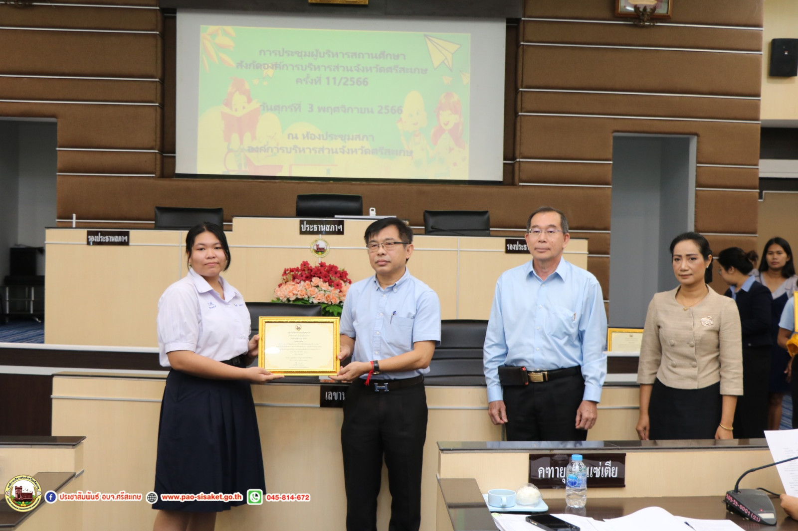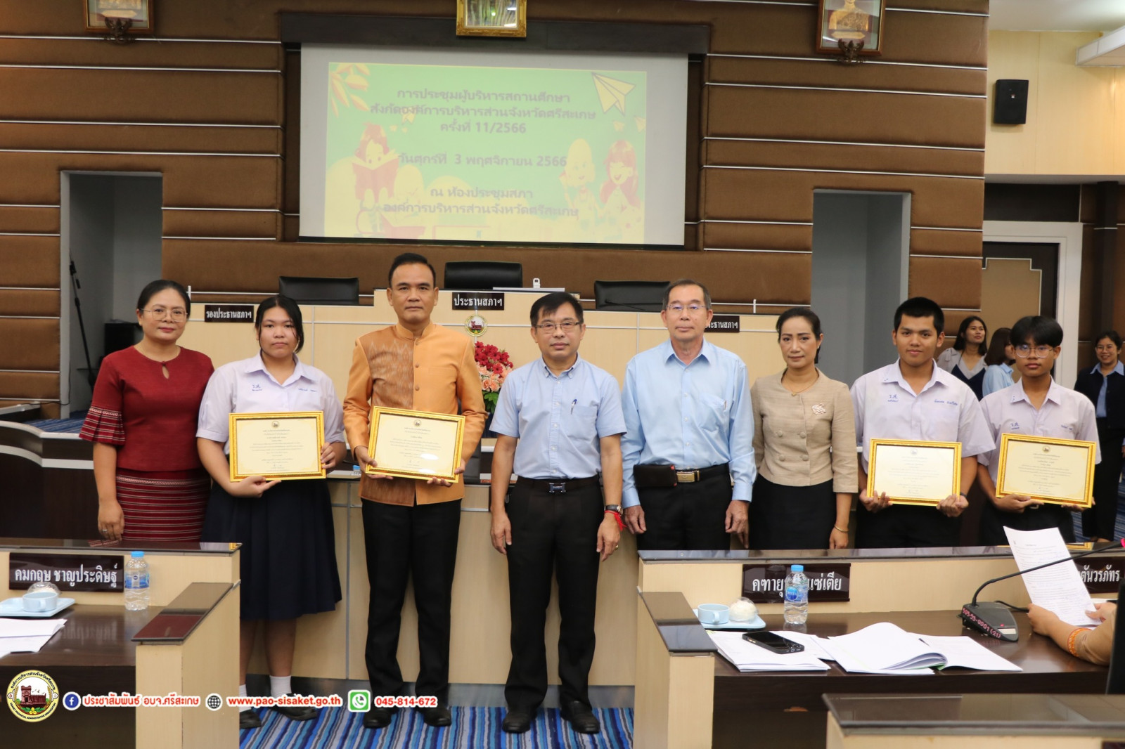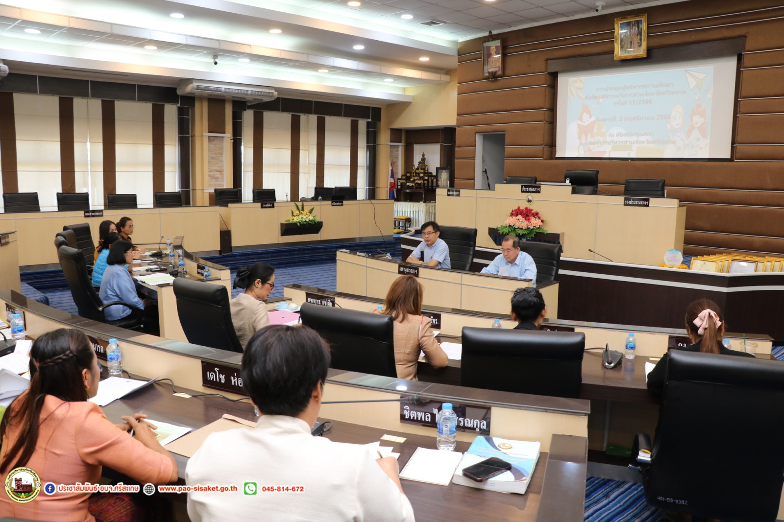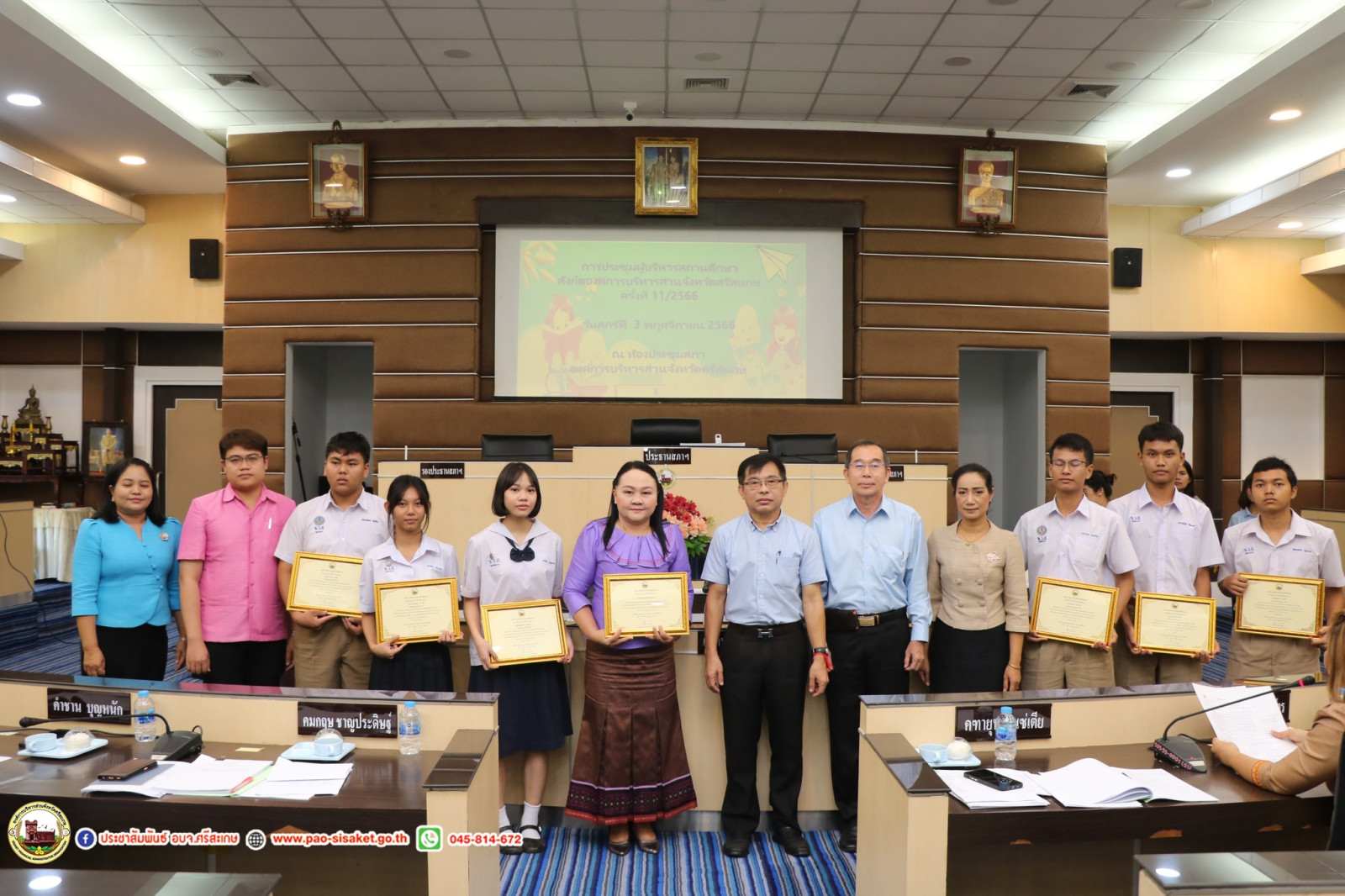 วันที่ 3 พฤศจิกายน พ.ศ. 2566 เวลา 09.30 น. ณ ณ ห้องประชุมสภาองค์การบริหารส่วนจังหวัดศรีสะเกษ องค์การบริหารส่วนจังหวัดศรีสะเกษ #นายวิชิต_ไตรสรณกุล นายกองค์การบริหารส่วนจังหวัดศรีสะเกษ มอบหมายให้ นายมานะพันธ์ อังสกุลเกียรติ รองนายกองค์การบริหารส่วนจังหวัดศรีสะเกษ เป็นประธานการประชุมผู้บริหารสถานศึกษา สังกัดองค์การบริหารส่วนจังหวัดศรีสะเกษ ครั้งที่ 11/2566 โดยมีนายไกรศักดิ์ วรทัต ปลัดองค์การบริหารส่วนจังหวัดศรีสะเกษ หัวหน้าส่วนราชการ ข้าราชการ ผู้บริหารสถานศึกษาสังกัดองค์การบริหารส่วนจังหวัดศรีสะเกษ เข้าร่วมการประชุมโดยพร้อมพรียง