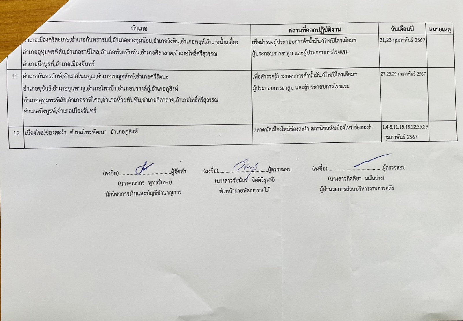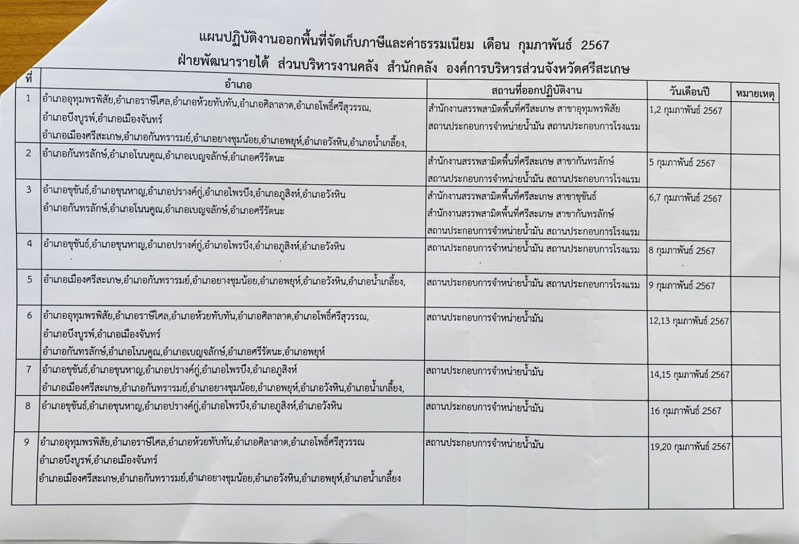 แผนปฏิบัติงานออกพื้นที่จัดเก็บภาษีและค่าธรรมเนียม เดือน กุมภาพันธ์ 2567 ฝ่ายพัฒนารายได้ ส่วนบริหารงานคลัง สำนักคลัง องค์การบริหารส่วนจังหวัดศรีสะเกษ