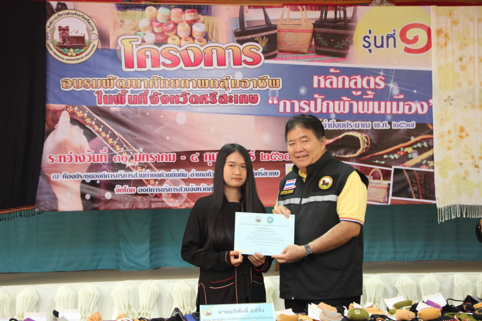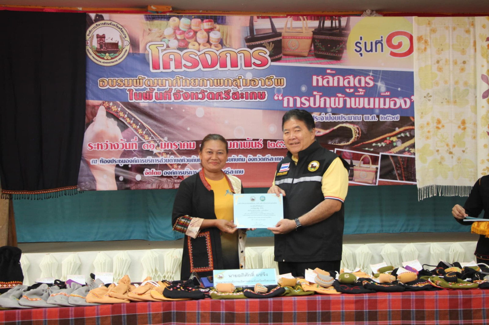 นายวิชิต_ไตรสรณกุล นายกองค์การบริหารส่วนจังหวัดศรีสะเกษ มอบหมายให้ นายอภิศักดิ์ แซ่จึง รองนายกองค์การบริหารส่วนจังหวัดศรีสะเกษ พร้อมด้วย นางสาวทัศนันท์ สุโพณะ หัวหน้าสำนักปลัดองค์การบริหารส่วนจังหวัด หัวหน้าส่วนราชการ ข้าราชการ เจ้าหน้าที่ที่เกี่ยวข้อ ร่วมปิด โครงการอบรมพัฒนาศักยภาพกลุ่มอาชีพ ในพื้นที่จังหวัดศรีสะเกษ หลักสูตร “การปักผ้าพื้นเมือง” ประจำปีงบประมาณ พ.ศ. 2567
