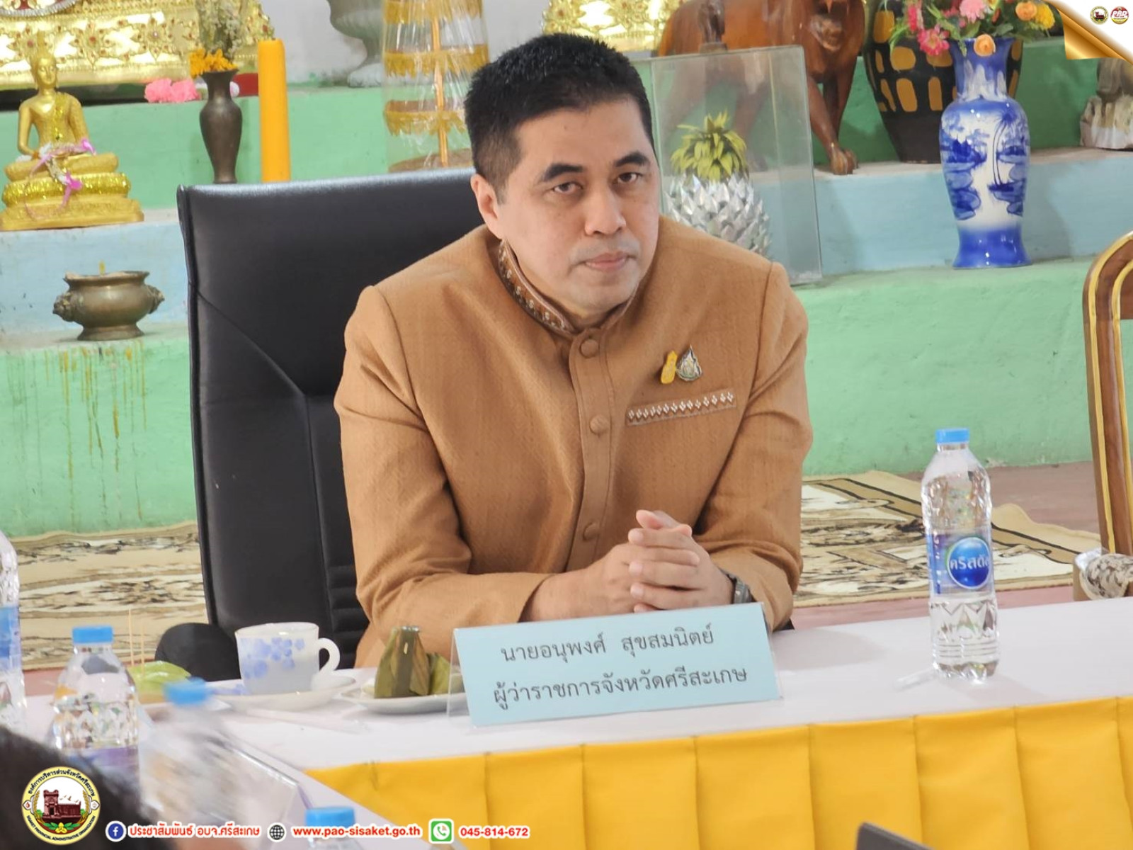 เมื่อวันที่ ๗ กุมภาพันธ์ ๒๕๖๗ ณ วัดปราสาทสระกำแพงน้อย ตำบลขะยูง อำเภออุทุมพรพิสัย จังหวัดศรีสะเกษ #นายวิชิต_ไตรสรณกุล นายกองค์การบริหารส่วนจังหวัดศรีสะเกษ มอบหมายให้ นายสวัสดิ์ ฤทธิสิงห์ รองปลัดองค์การบริหารส่วนจังหวัดศรีสะเกษ ผู้บริหารท้องถิ่นระดับสูง ร่วมประชุม แผนพัฒนา ฟื้นฟู บูรณะแหล่งน้ำศักดิ์สิทธิ์ เพื่อเฉลิมพระเกียรติพระบาทสมเด็จหัว เนื่องในโอกาสมหามงคลเฉลิมพระชนมพรรษา ๖ รอบ ๒๘ กรกฎาคม ๒๕๖๗ แหล่งน้ำศักดิ์สิทธิ์ (อโรคยาศาล) ปราสาทสระกำแพงน้อย ตำบลขะยูง อำเภออุทุมพรพิสัย จังหวัดศรีสะเกษ โดยมี นายอนุพงศ์ สุขสมนิตย์ ผู้ว่าราชการจังหวัดศรีสะเกษ เป็นประธานการประชุม และมีหัวหน้าส่วนราชการจังหวัดศรีสะเกษที่เกี่ยวข้อง เข้าร่วมการประชุมในครั้งนี้