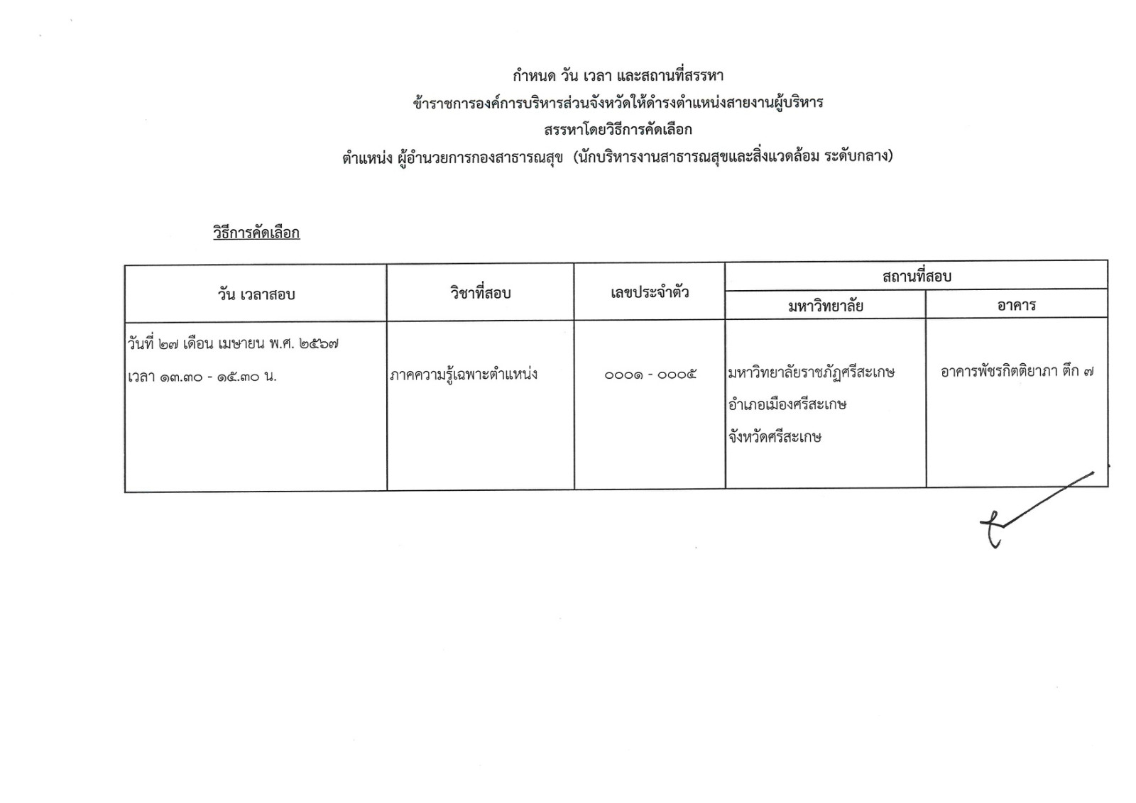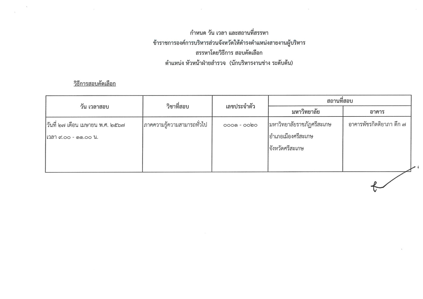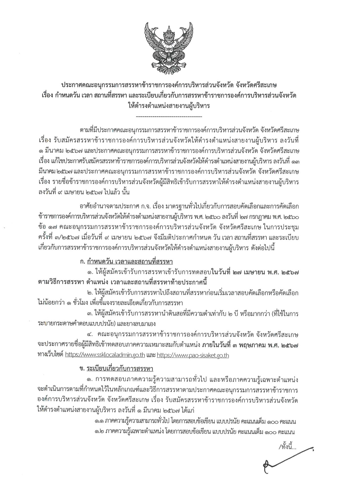 ประกาศคณะอนุกรรมการสรรหาข้าราชการองค์การบริหารส่วนจังหวัด จังหวัดศรีสะเกษ เรื่อง กำหนดวัน เวลา สถานที่สรรหา และระเบียบเกี่ยวกับการสรรหาข้าราชการองค์การบริหารส่วนจังหวัด ให้ดำรงตำแหน่งสายงานผู้บริหาร