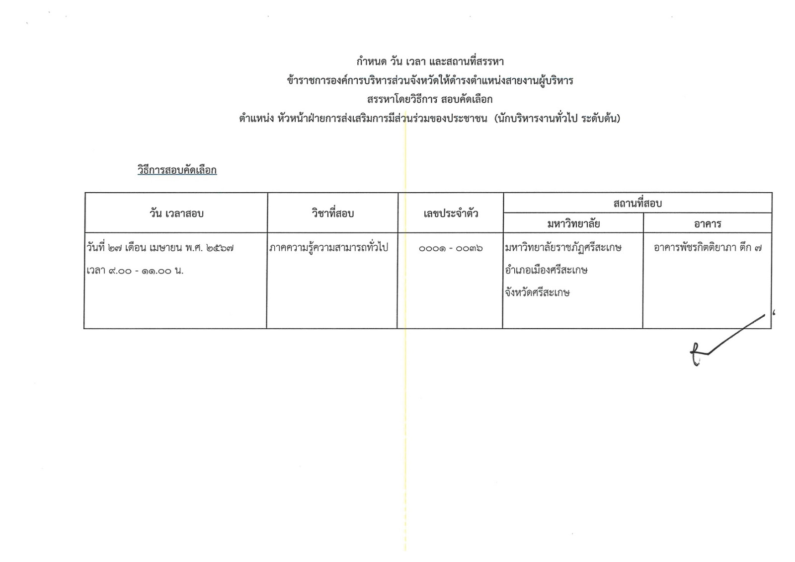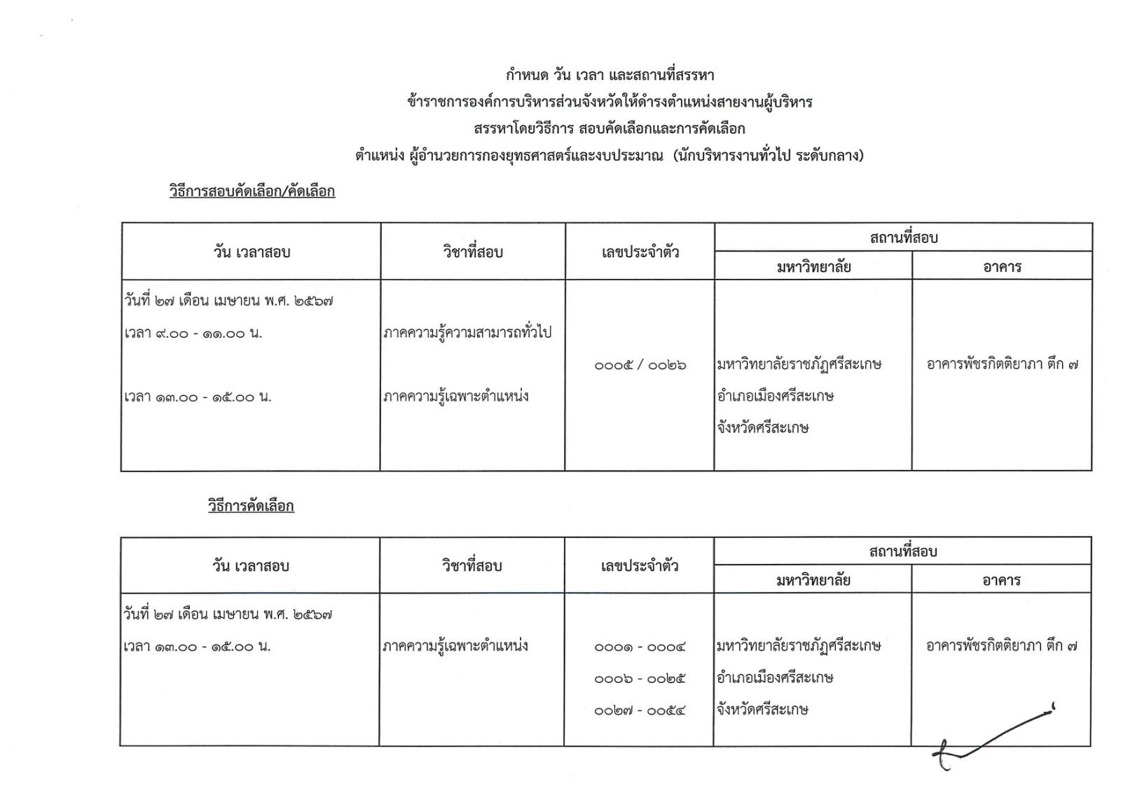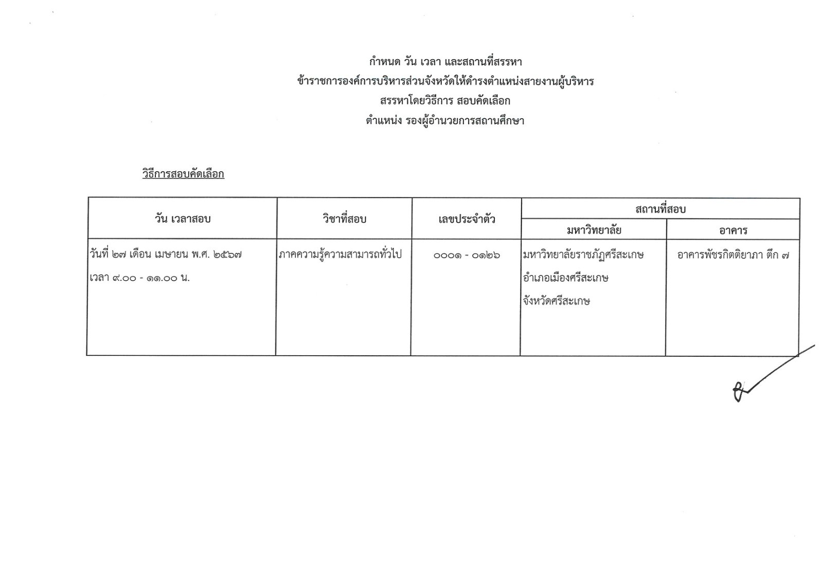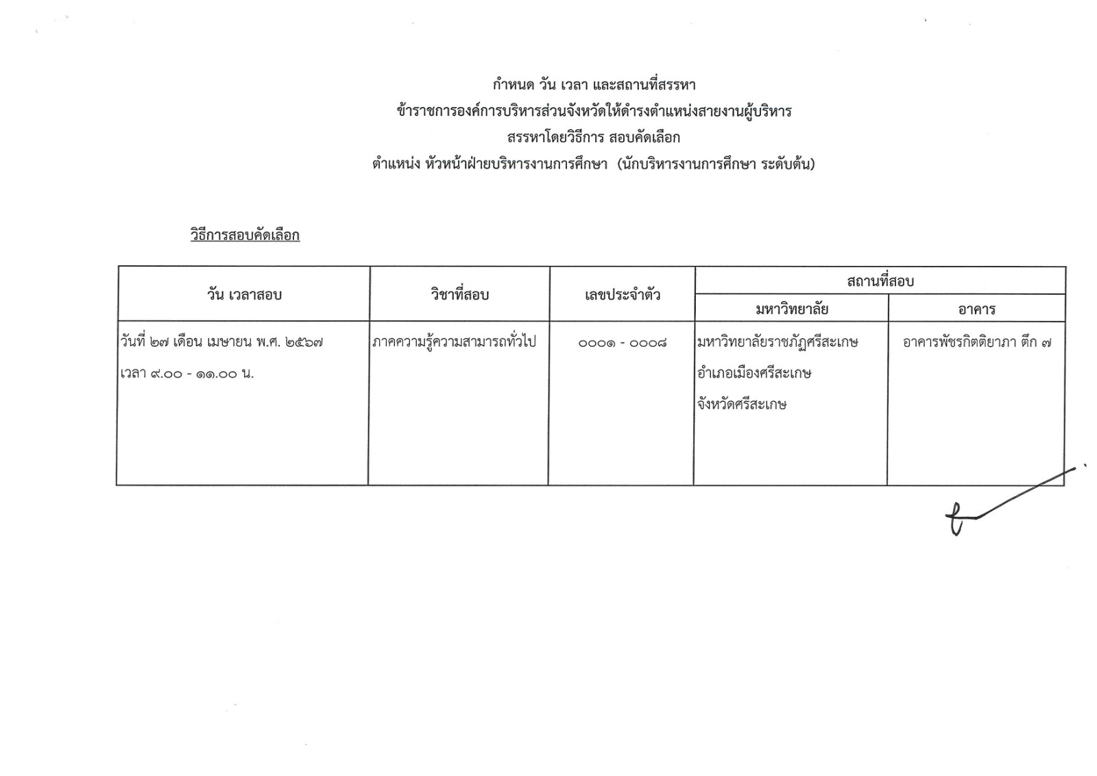 ประกาศคณะอนุกรรมการสรรหาข้าราชการองค์การบริหารส่วนจังหวัด จังหวัดศรีสะเกษ เรื่อง กำหนดวัน เวลา สถานที่สรรหา และระเบียบเกี่ยวกับการสรรหาข้าราชการองค์การบริหารส่วนจังหวัด ให้ดำรงตำแหน่งสายงานผู้บริหาร