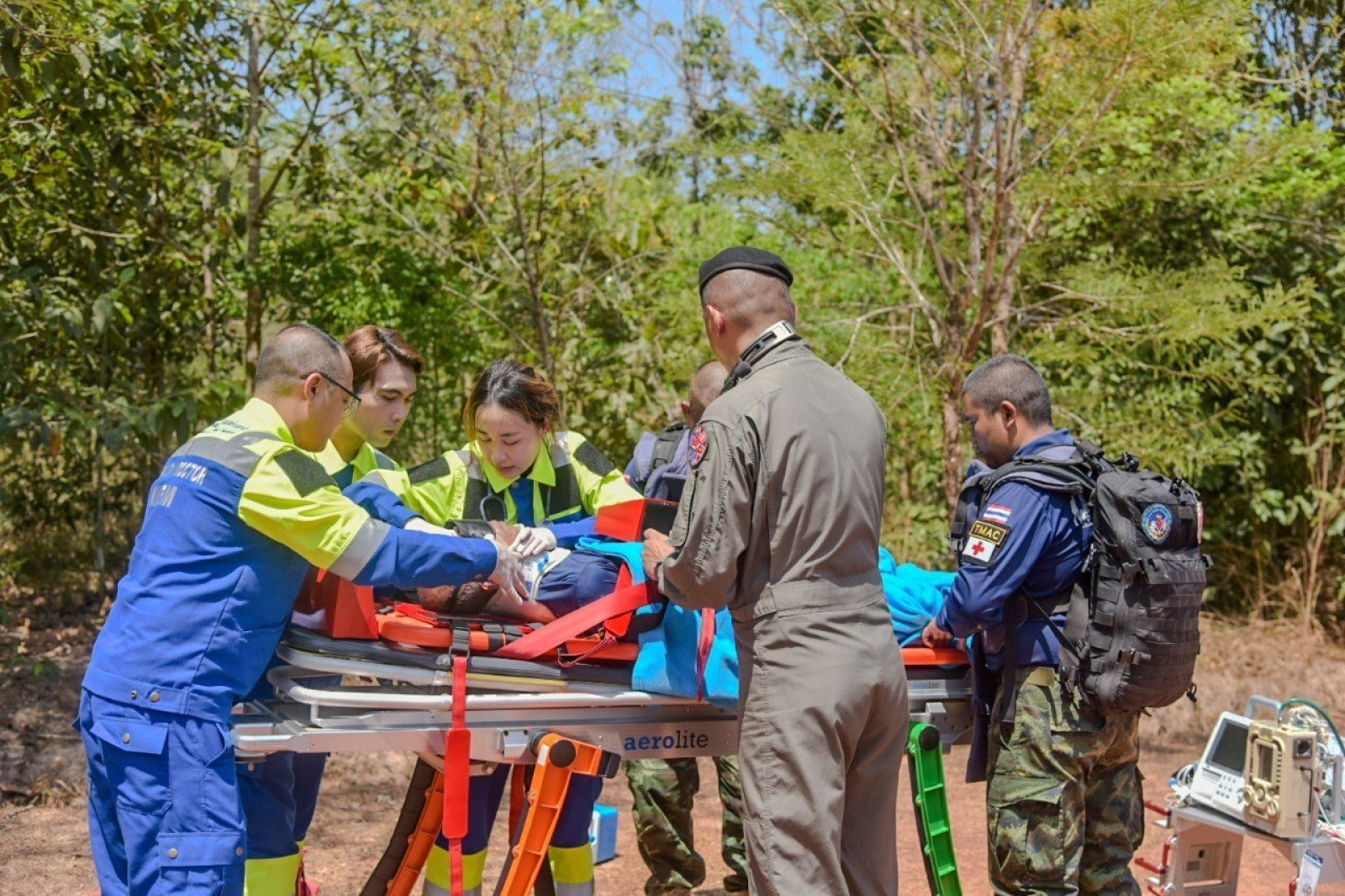 วันที่ 3 เมษายน 2567 ซ้อมแผนการลำเลียงผู้ป่วยทางอากาศจากเหตุทุ่นระเบิดในพื้นที่จังหวัดศรีสะเกษ เขตสุขภาพที่10