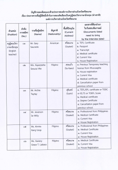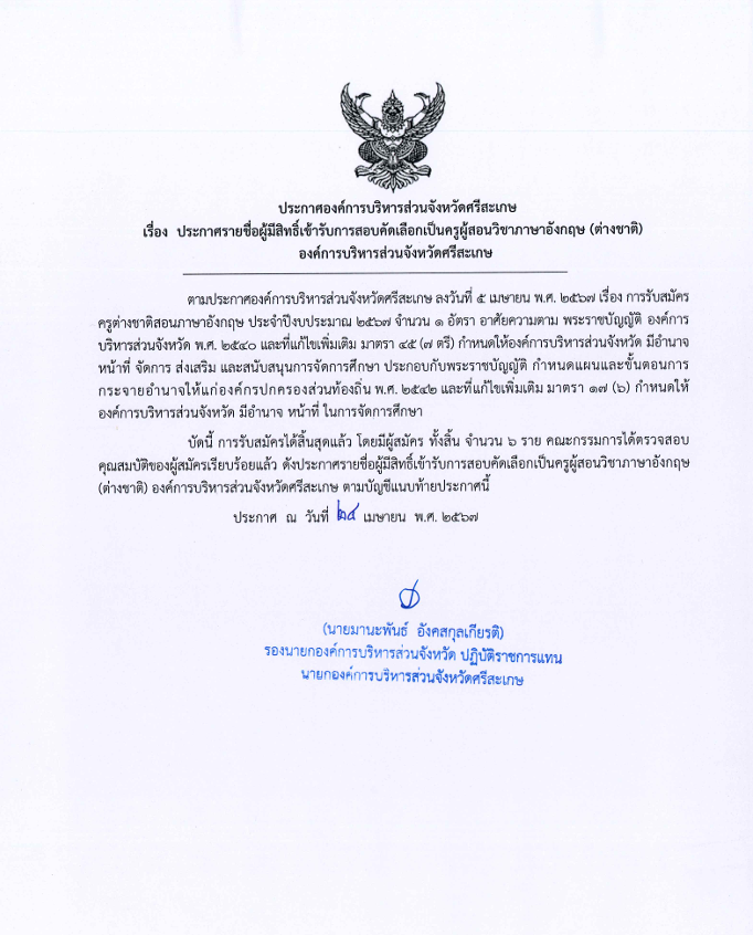 ประกาศรายชื่อผู้มีสิทธิ์เข้ารับการสอบคัดเลือกเป็นครูผู้สอนวิชาภาษาอังกฤษ ต่างชาติ) องค์การบริหารส่วนจังหวัดศรีสะเกษ