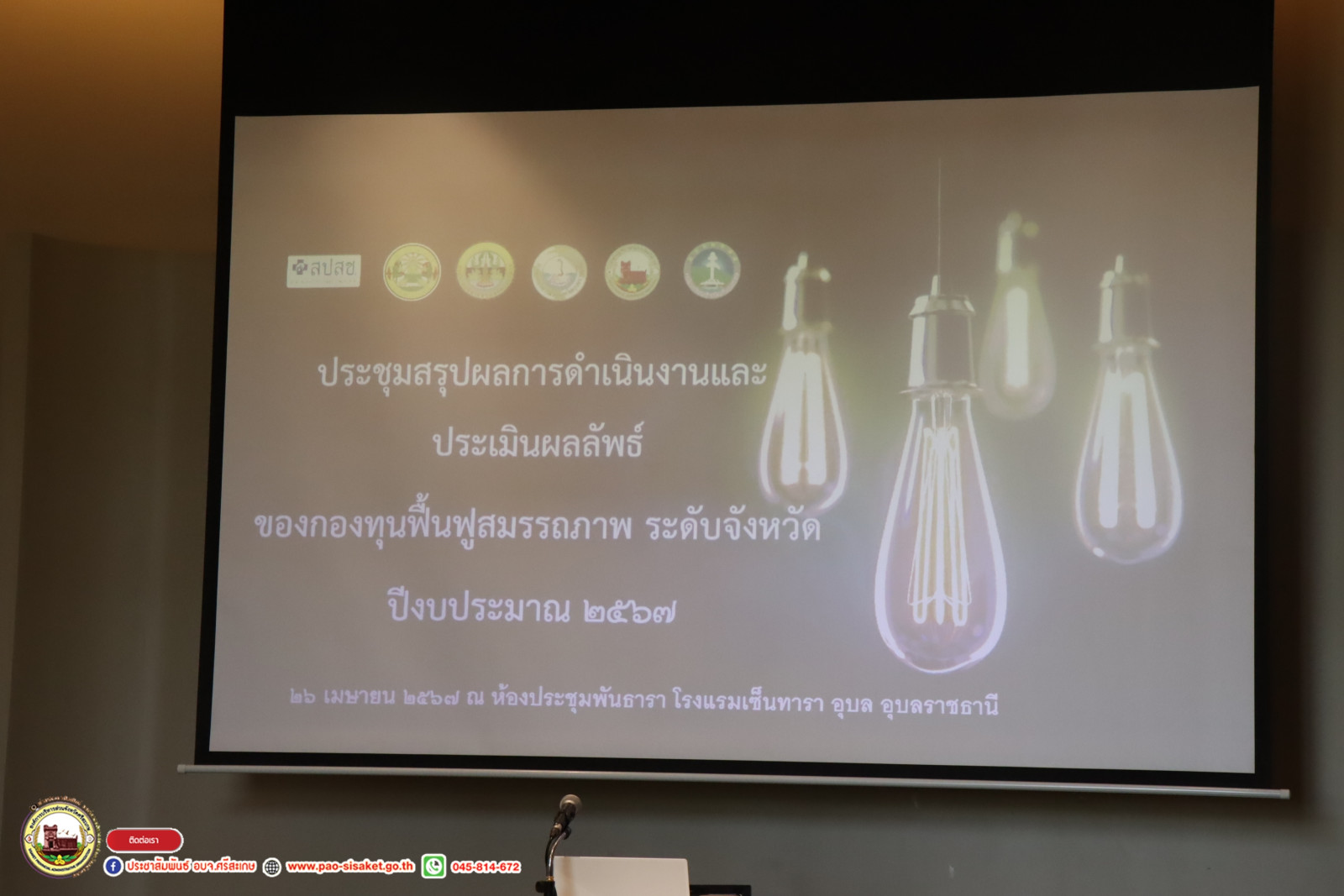เมื่อวันศุกร์ที่ ๒๖ เมษายน ๒๕๖๗ เวลา ๐๙.๐๐ น. ณ โรงแรมเซ็นทาราอุบลจังหวัดอุบลราชธานี #นายวิชิต_ไตรสรณกุล นายกองค์การบริหารส่วนจังหวัดศรีสะเกษ มอบหมายให้ นายอภิศักดิ์ แซ่จึง รองนายกองค์การบริหารส่วนจังหวัดศรีสะเกษ นางสาวรภัทภร สายเย็น รองปลัดองค์การบริหารส่วนจังหวัดศรีสะเกษ พร้อมด้วย ข้าราชการ พนักงานสังกัดองค์การบริหารส่วนจังหวัดศรีสะเกษ ร่วมประชุมสรุปผลการดำเนินงานและประเมินผลลัพธ์ของกองทุนพื้นฟูสมรรถภาพ ระดับจังหวัด ประจำปีงบประมาณ พ.ศ.๒๕๖๖ โดยมี สำนักงานหลักประกันสุขภาพแห่งชาติเขต ๑๐ อุบลราชธานี ผู้บริหาร เจ้าหน้าที่ กองทุนพื้นฟูสมรรถภาพ ระดับจังหวัด จังหวัดอำนาจเจริญ ยโสธร อุบลราชธานี และมุกดาหาร เข้าร่วมการประชุมในครั้งนี้