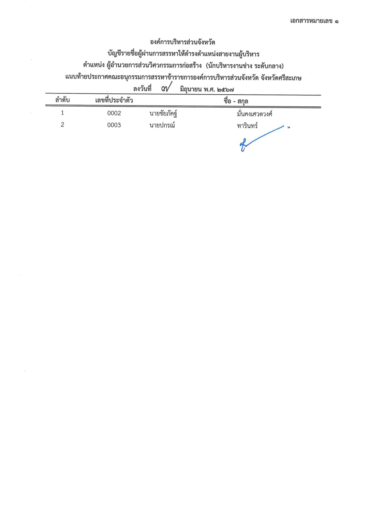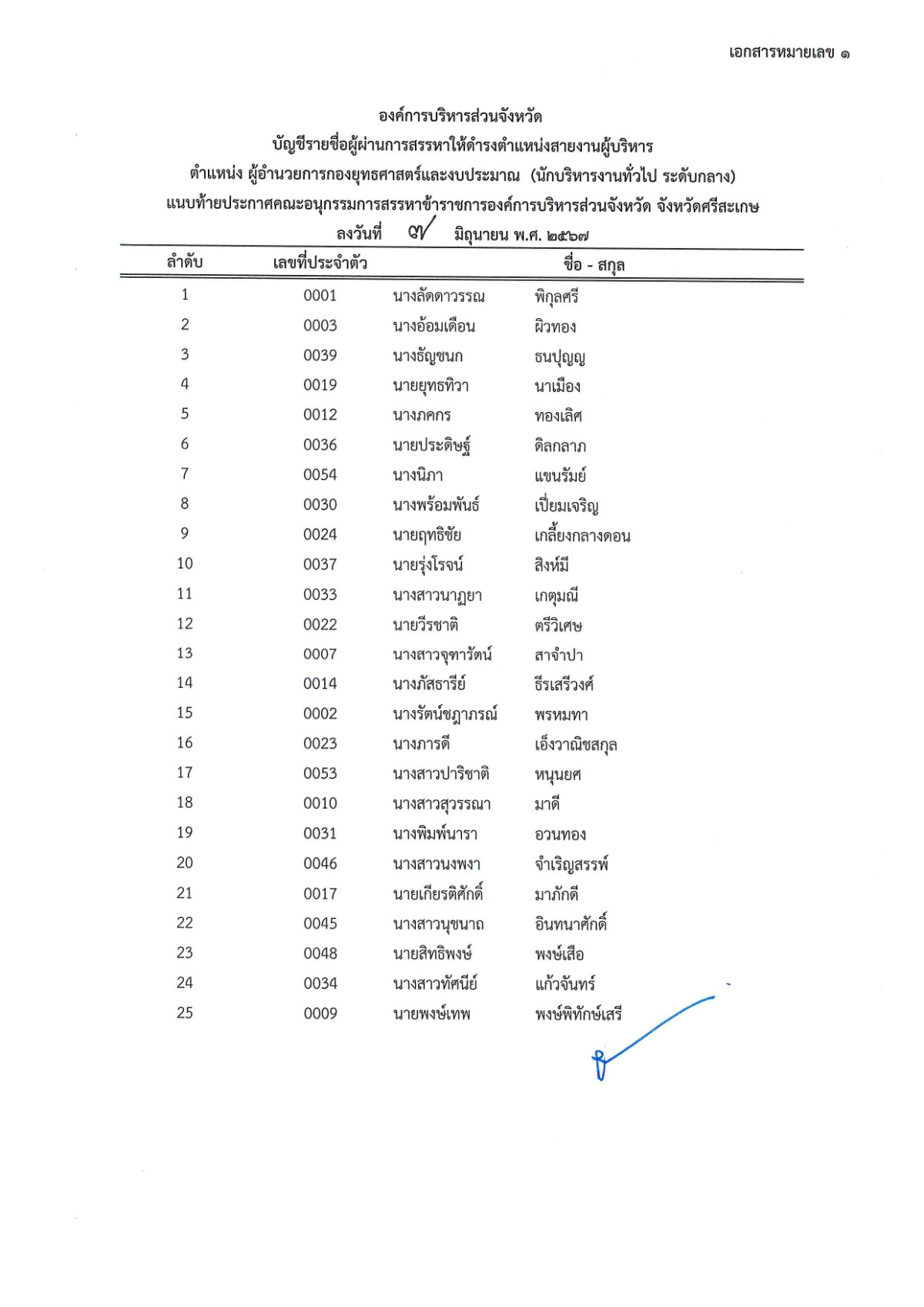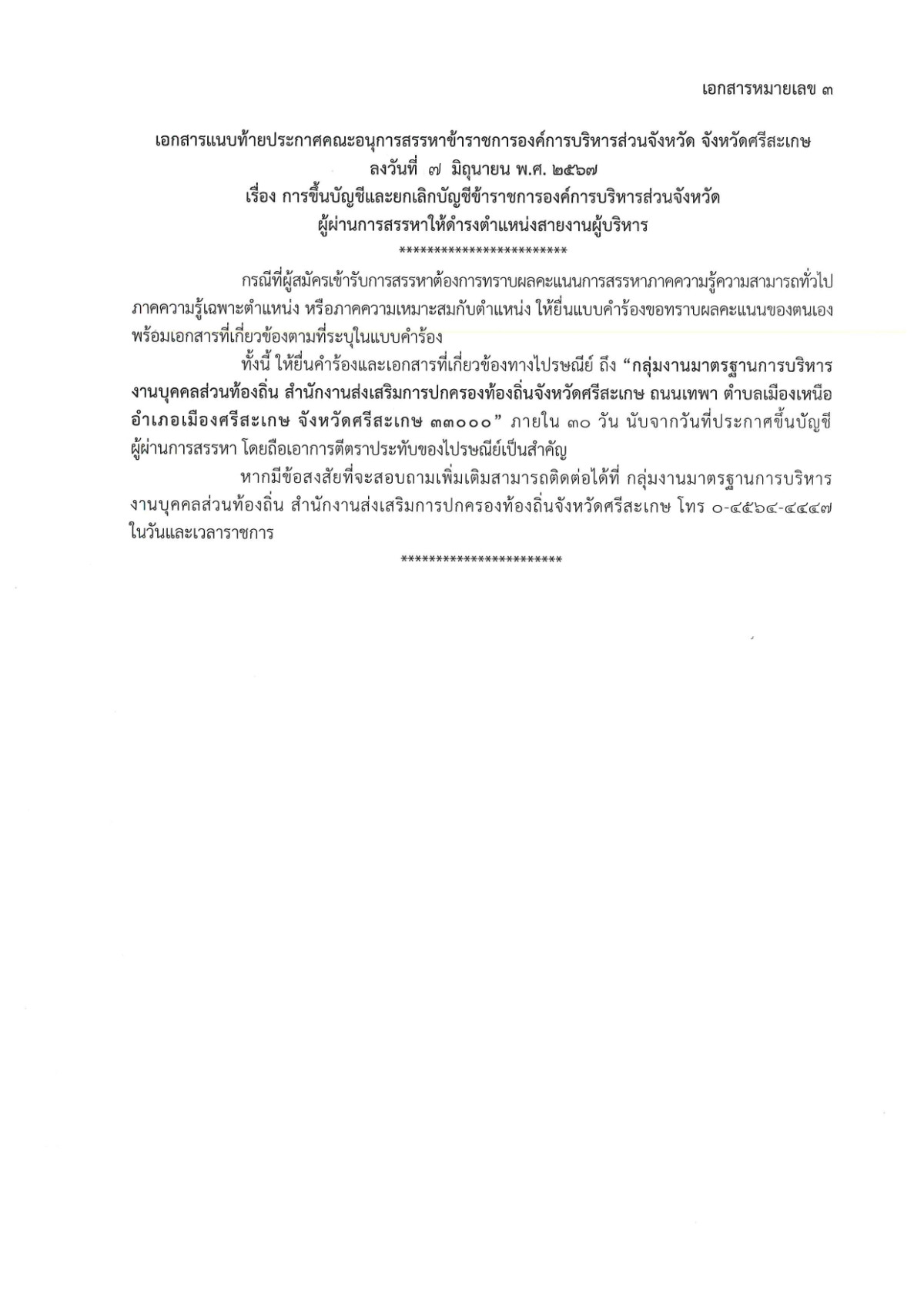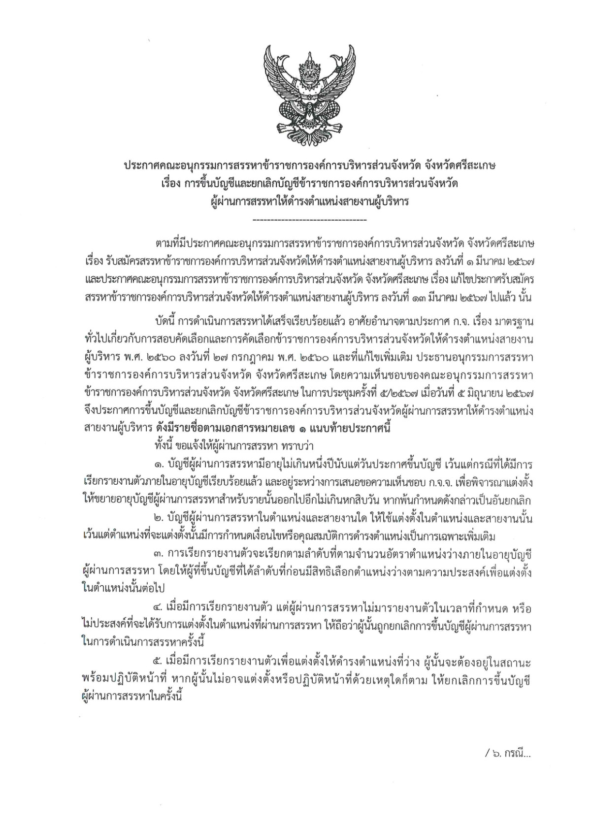 ประกาศคณะอนุกรรมการสรรหาข้าราชการองค์การบริหารส่วนจังหวัด จังหวัดศรีสะเกษ ผู้ผ่านการสรรหาให้ดำรงตำแหน่งสายงานผู้บริหาร