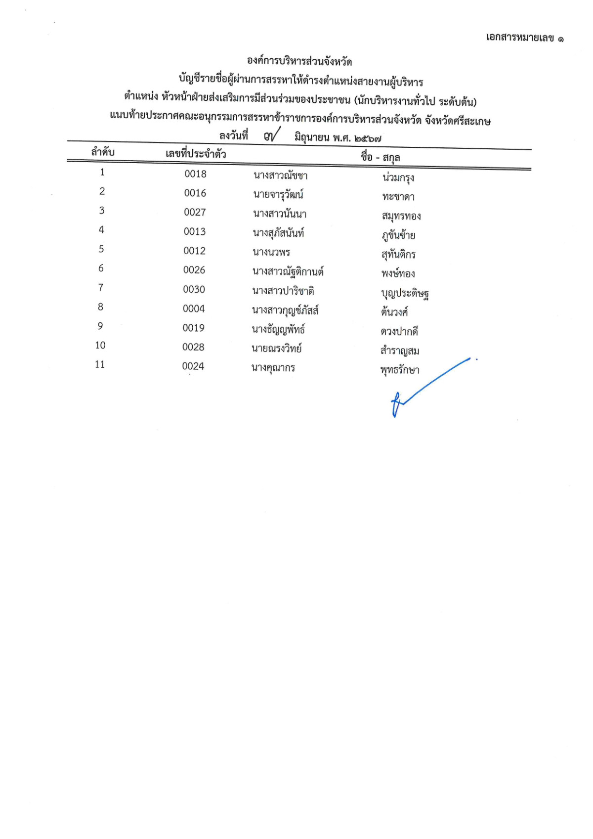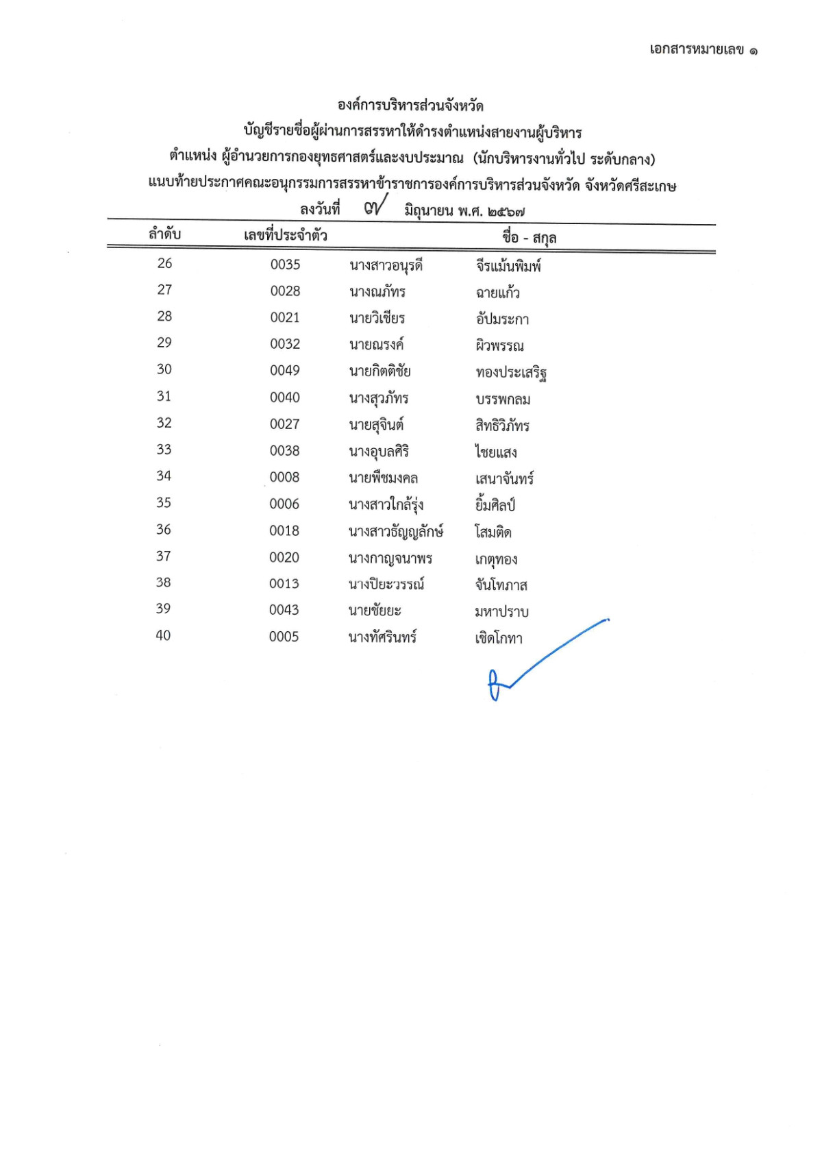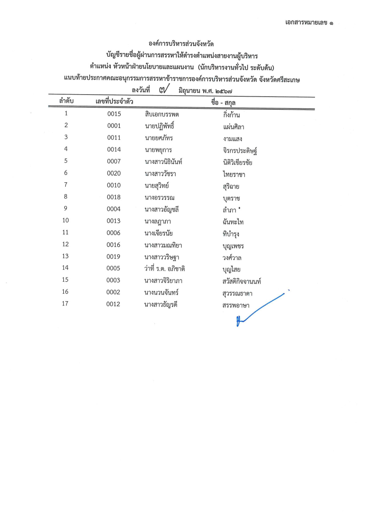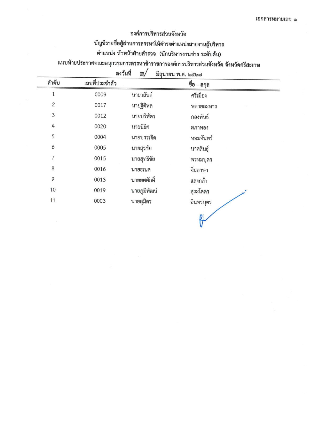 ประกาศคณะอนุกรรมการสรรหาข้าราชการองค์การบริหารส่วนจังหวัด จังหวัดศรีสะเกษ ผู้ผ่านการสรรหาให้ดำรงตำแหน่งสายงานผู้บริหาร