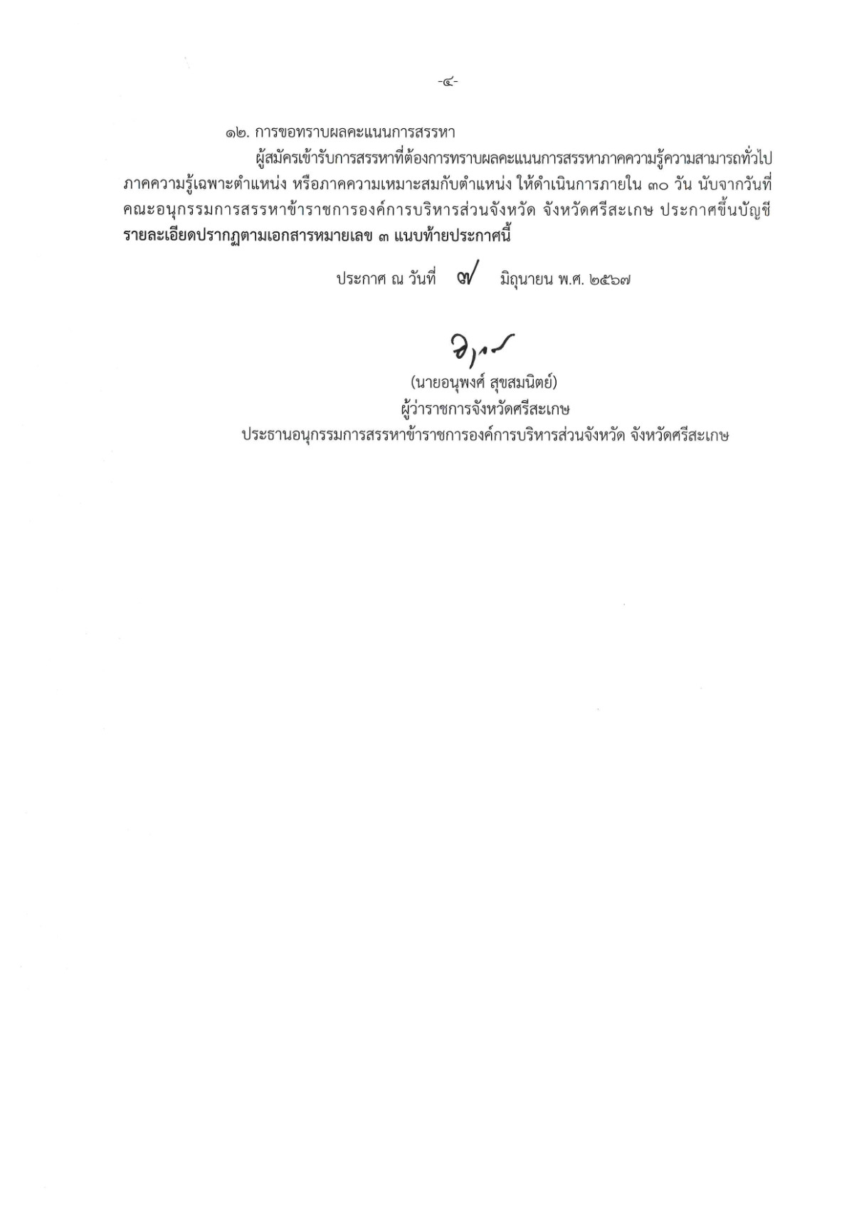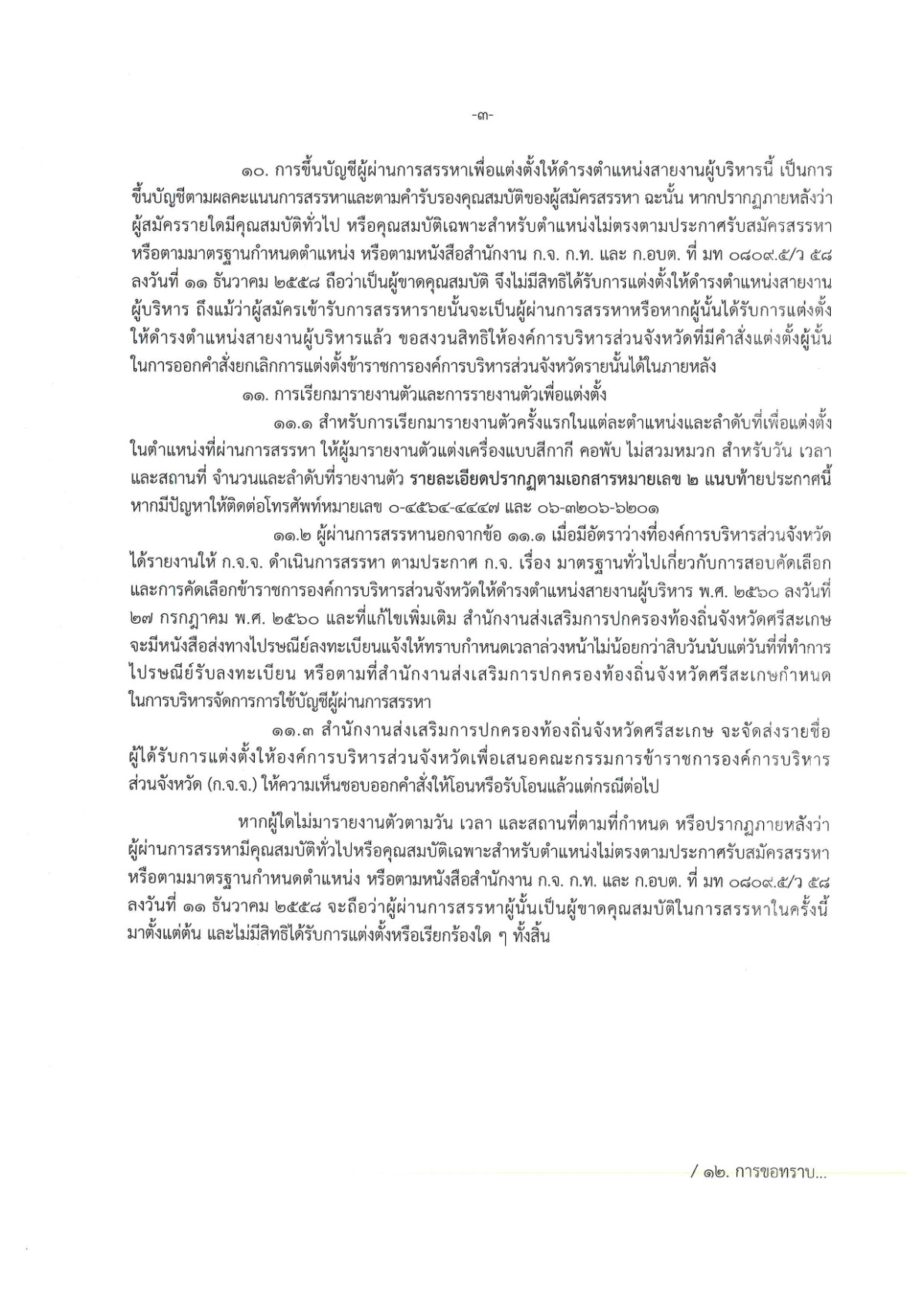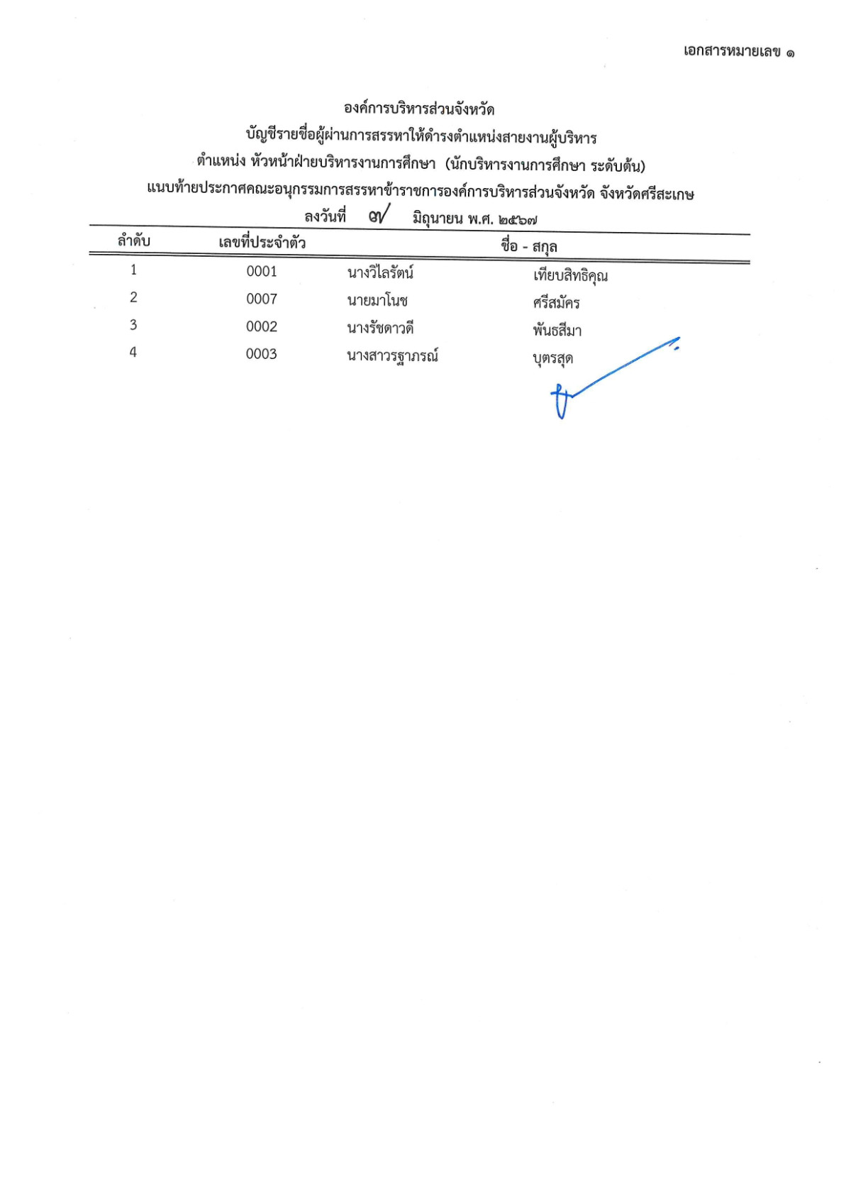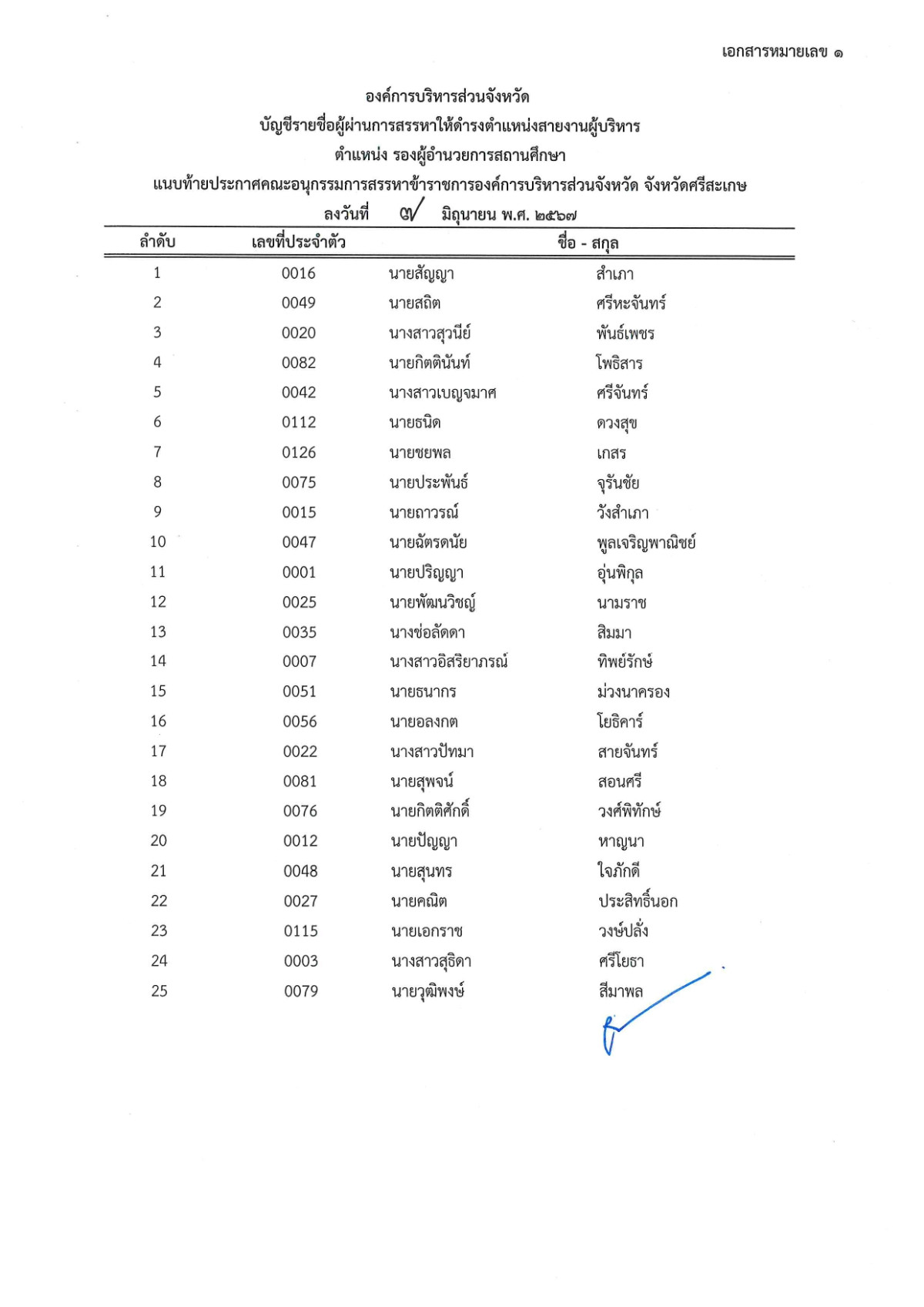 ประกาศคณะอนุกรรมการสรรหาข้าราชการองค์การบริหารส่วนจังหวัด จังหวัดศรีสะเกษ ผู้ผ่านการสรรหาให้ดำรงตำแหน่งสายงานผู้บริหาร