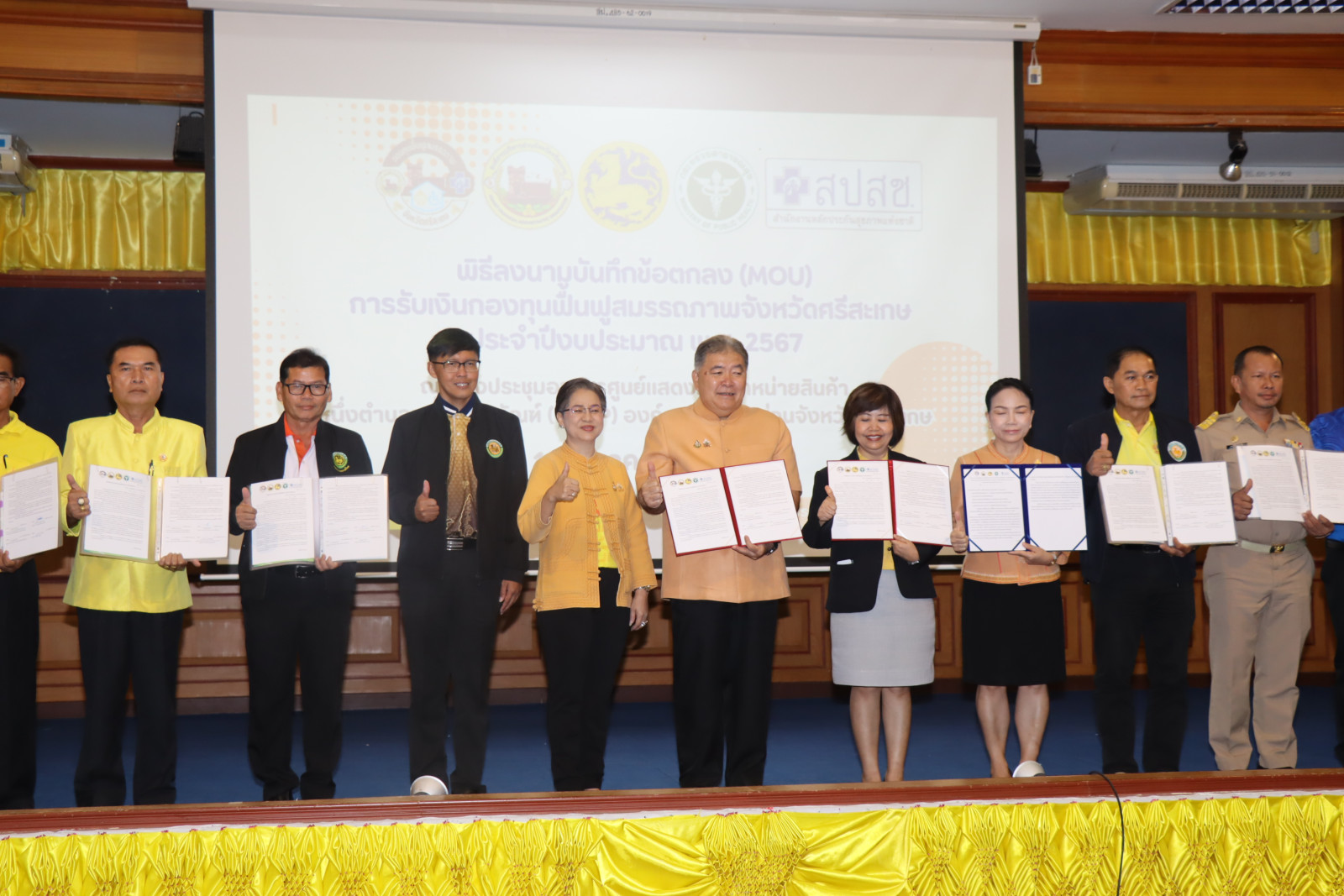 พิธีลงนามการจัดทำบันทึกข้อตกลงการรับเงินกองทุนฟื้นฟูสมรรถภาพจังหวัดศรีสะเกษในวันนี้ มีหน่วยงานราชการร่วมเข้าพิธีลงนามบันทึกข้อตกลงฯ จำนวน 47 แห่ง โดยมีวัตถุประสงค์การดำเนินงาน ดังนี้