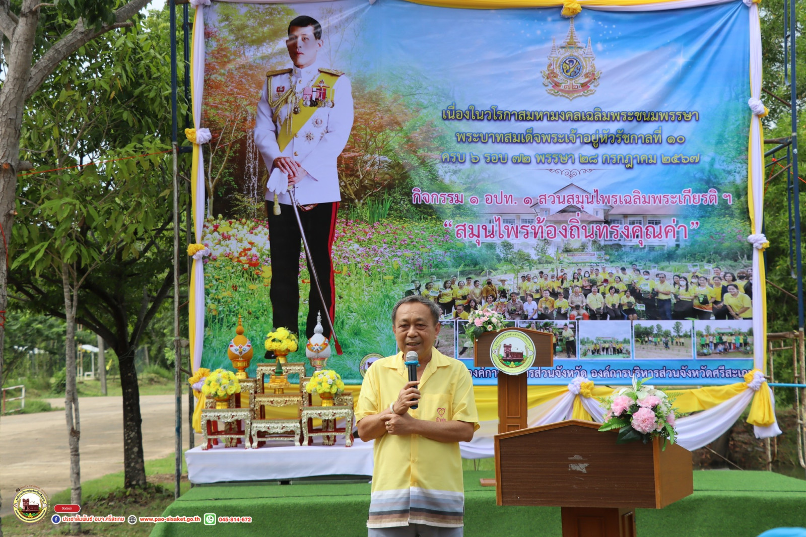 วันที่ 26 กรกฎาคม 2567 เวลา 10.00 น. นายวิชิต ไตรสรณกุล นายกองค์การบริหารส่วนจังหวัดศรีสะเกษ มอบหมายให้ นายอภิศักดิ์ แซ่จึง รองนายกองค์การบริหารส่วนจังหวัดศรีสะเกษ เป็นประธานเปิดงาน 1 อปท. 1 สวนสมุนไพร เฉลิมพระเกียรติพระบาทสมเด็จพระเจ้าอยู่หัว "สมุนไพรท้องถิ่นทรงคุณค่า" องค์การบริหารส่วนจังหวัดศรีสะเกษ ประจำปีงบประมาณ 2567 เนื่องในโอกาสพระราชพิธีมหามงคลเฉลิมพระชนมพรรษา 6 รอบ 72 พรรษา 28 กรกฎาคม 2567 โดยมี นายสวัสดิ์ ฤทธิสิงห์ รองปลัดองค์การบริหารส่วนจังหวัดศรีสะเกษ ผู้บริหารท้องถิ่นระดับสูง เป็นผู้กล่าวรายงาน ร่วมด้วย นายอดิศักดิ์ ทองจันทร์แก้ว ผู้เชี่ยวชาญพิเศษด้านการบริหารองค์การบริหารส่วนจังหวัดศรีสะเกษ หัวหน้าส่วนราชการ ข้าราชการ พนักงานและลูกจ้าง องค์การบริหารส่วนจังหวัดศรีสะเกษ ซึ่งได้ร่วมปลูกต้นไม้เพิ่มเติมด้วยความร่วมมือร่วมใจ ณ สวนสมุนไพร บริเวณหลังอาคารสำนักงานองค์การบริหารส่วนจังหวัดศรีสะเกษ