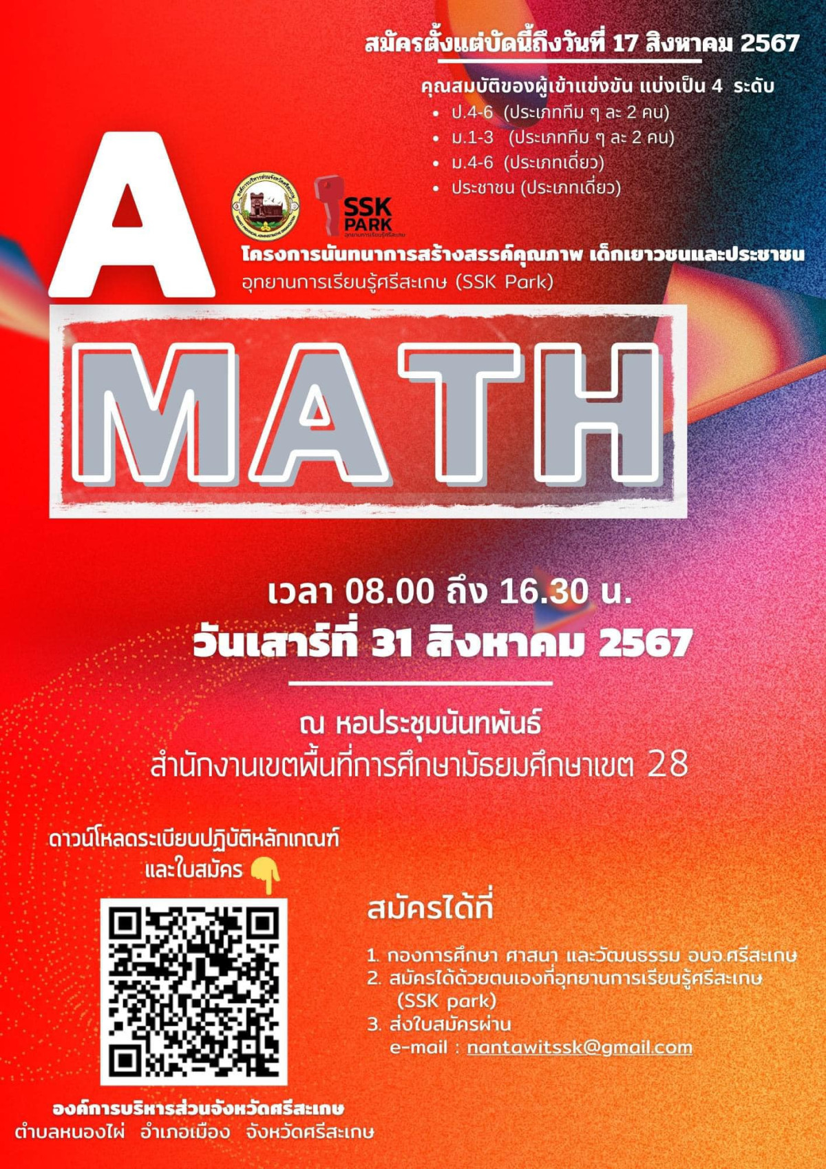 องค์การบริหารส่วนจังหวัดศรีสะเกษ ขอเชิญสมัครเข้าร่วมการแข่งขัน A-MATH จังหวัดศรีสะเกษ