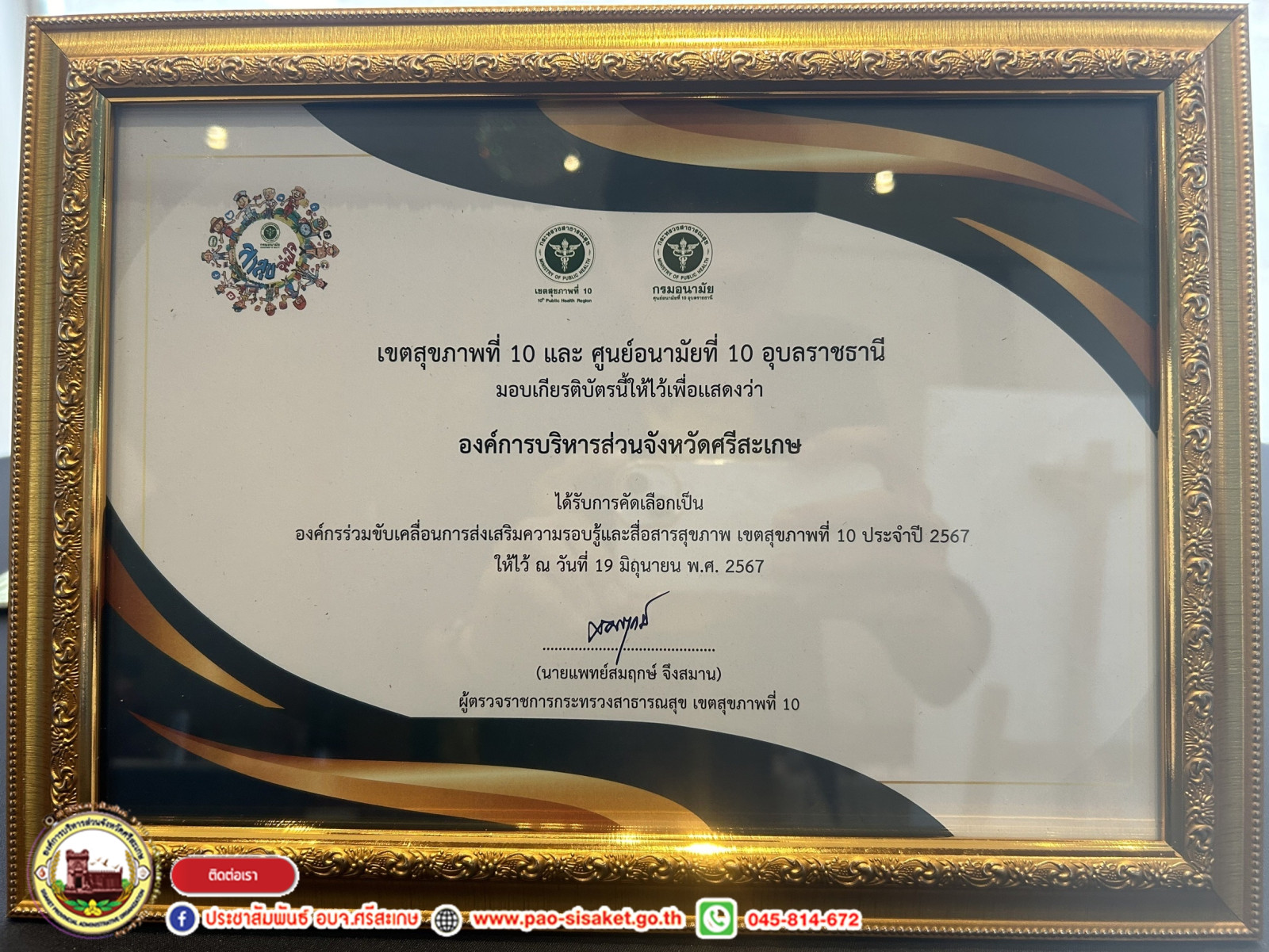 อบจ.ศรีสะเกษ รับเกียรติบัตรเชิดชูเกียรติ องค์กรร่วมขับเคลื่อนการส่งเสริมความรอบรู้และสื่อสารสุขภาพ เขตสุขภาพที่ ๑๐ ประจำปี ๒๕๖๗