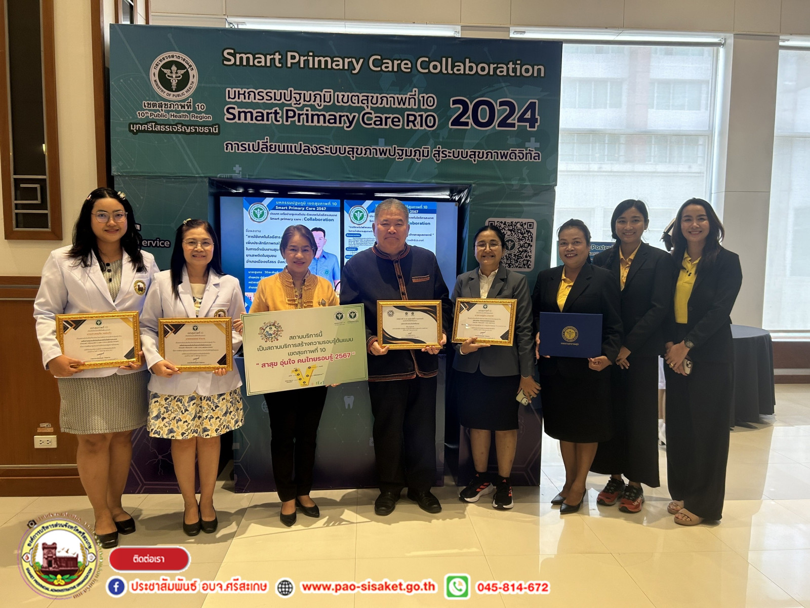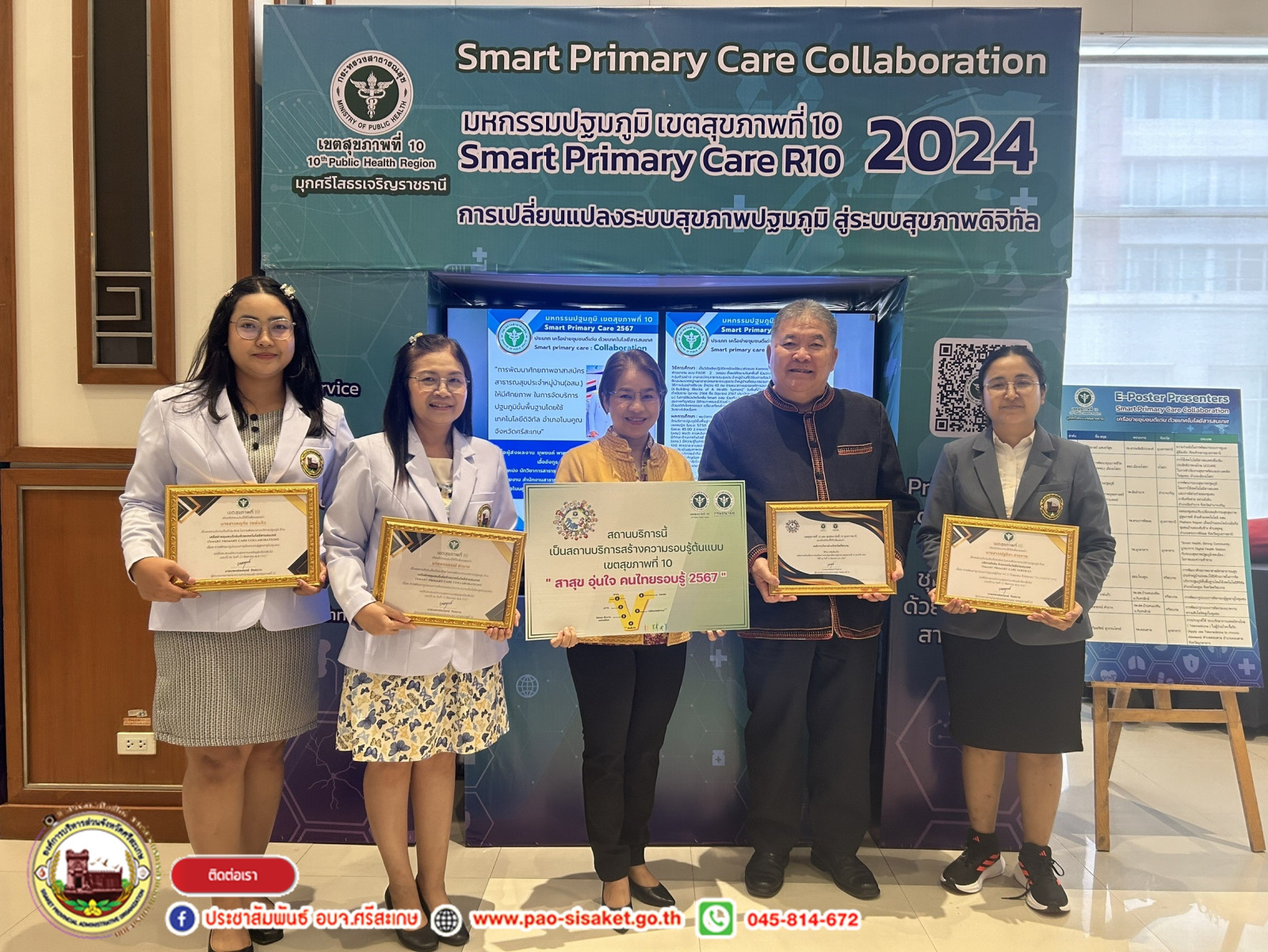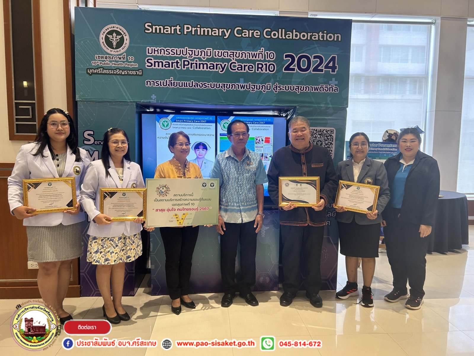 เมื่อวันที่ ๒๓ สิงหาคม ๒๕๖๗ เวลา ๐๙.๐๐ น. ณ โรงแรมสุนีย์แกรนด์ แอนด์ คอนเวนชัน เซ็นเตอร์ จังหวัดอุบลราชธานี #นายวิชิต_ไตรสรณกุล นายกองค์การบริหารส่วนจังหวัดศรีสะเกษ มอบหมายให้ นายอภิศักดิ์ แซ่จึง รองนายกองค์การบริหารส่วนจังหวัด นางสาวรภัทภร สายเย็น รองปลัดองค์การบริหารส่วนจังหวัดศรีสะเกษ พร้อมด้วยข้าราชการสังกัดองค์การบริหารส่วนจังหวัดศรีสะเกษ ร่วมประชุมเชิงปฏิบัติการแลกเปลี่ยนเรียนรู้ผลการดำเนินงานทีมสหวิชาชีพในระบบบริการปฐมภูมิ สู่ Smart Primary CARE เขตสุขภาพที่ ๑๐ “มหกรรมปฐมภูมิ ๒๕๖๗” และรับเกียรติบัตรเชิดชูเกียรติ องค์กรร่วมขับเคลื่อนการส่งเสริมความรอบรู้และสื่อสารสุขภาพ เขตสุขภาพที่ ๑๐ ประจำปี ๒๕๖๗ โดยมี นพ.สมฤกษ์ จึงสมาน ผู้ตรวจราชการกระทรวงเขตสุขภาพที่ ๑๐ เป็นประธานในพิธี และมี นพ.ปฐมพงศ์ ปรุโปร่ง ประธานคณะกรรมการพัฒนาระบบส่งเสริมสุขภาพและระบบสุขภาพปฐมภูมิ เขตสุขภาพที่ ๑๐ พร้อมด้วยองค์กร ชุมชน ภาคีเครือข่ายรอบรู้ด้านสุขภาพ เขตสุขภาพที่ ๑๐ เข้าร่วมการประชุมในครั้งนี้