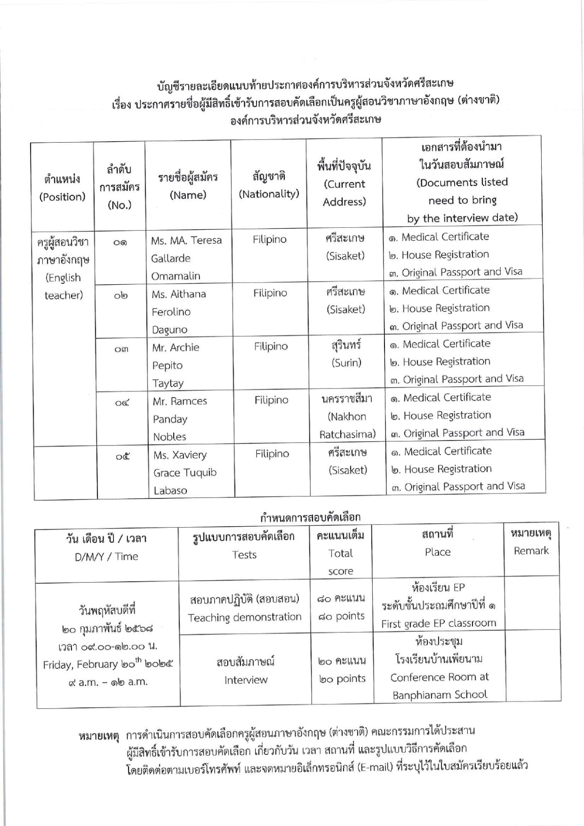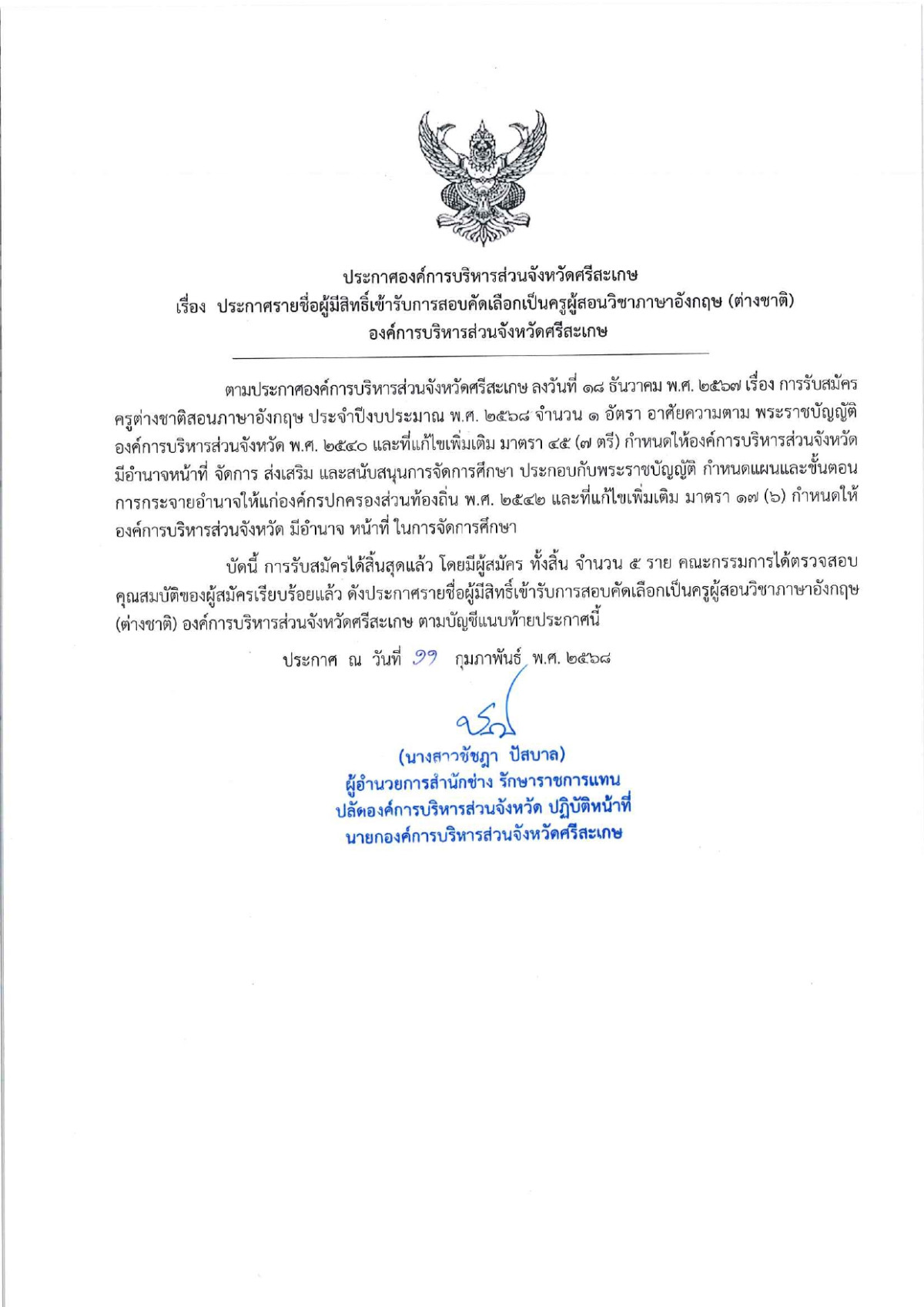 ประกาศองค์การบริหารส่วนจังหวัดศรีสะเกษ เรื่อง ประกาศรายชื่อผู้มีสิทธิ์เข้ารับการสอบคัดเลือกเป็นครูผู้สอนวิชาภาษาอังกฤษ (ต่างชาติ) องค์การบริหารส่วนจังหวัดศรีสะเกษ
