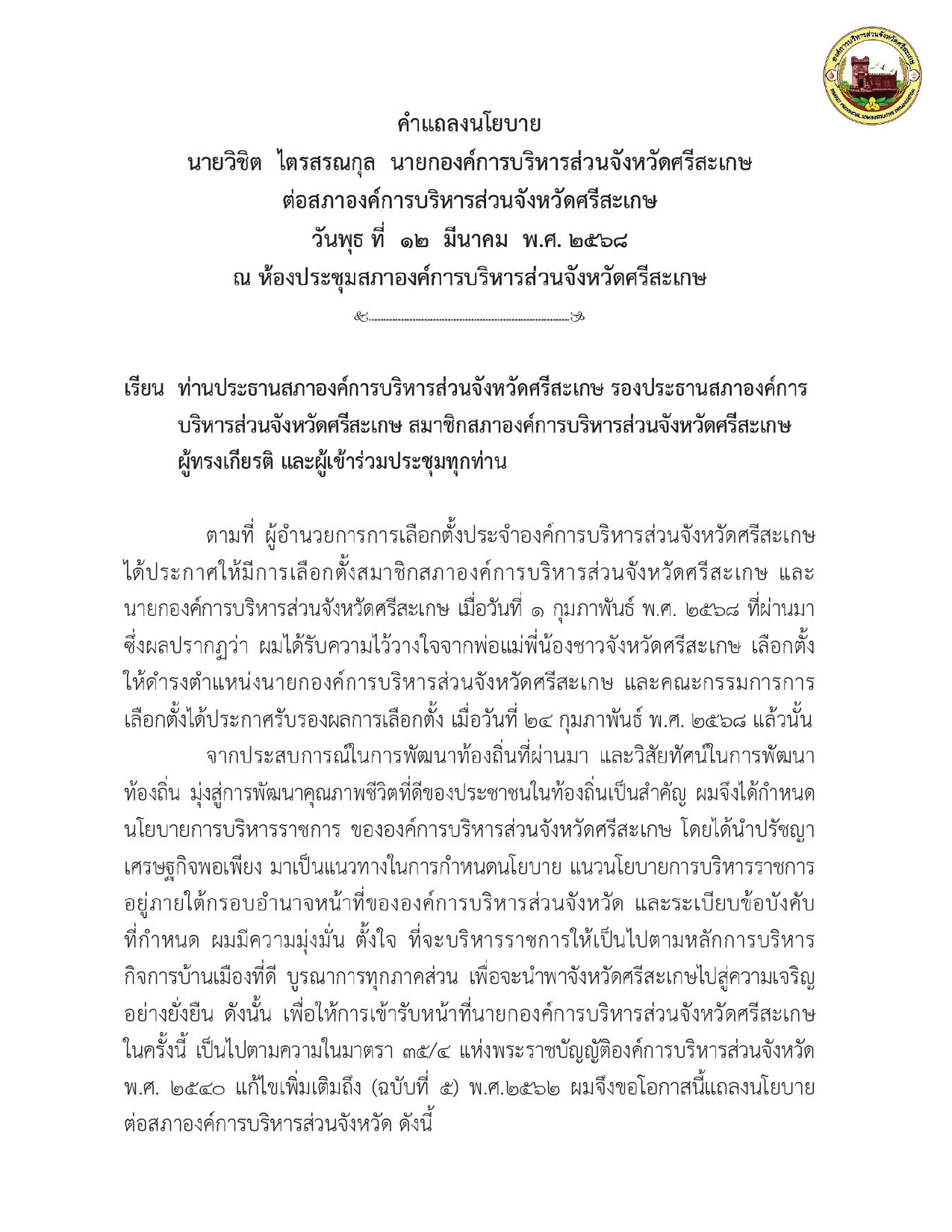 คำแถลงนายก อบจ.ศรีสะเกษ