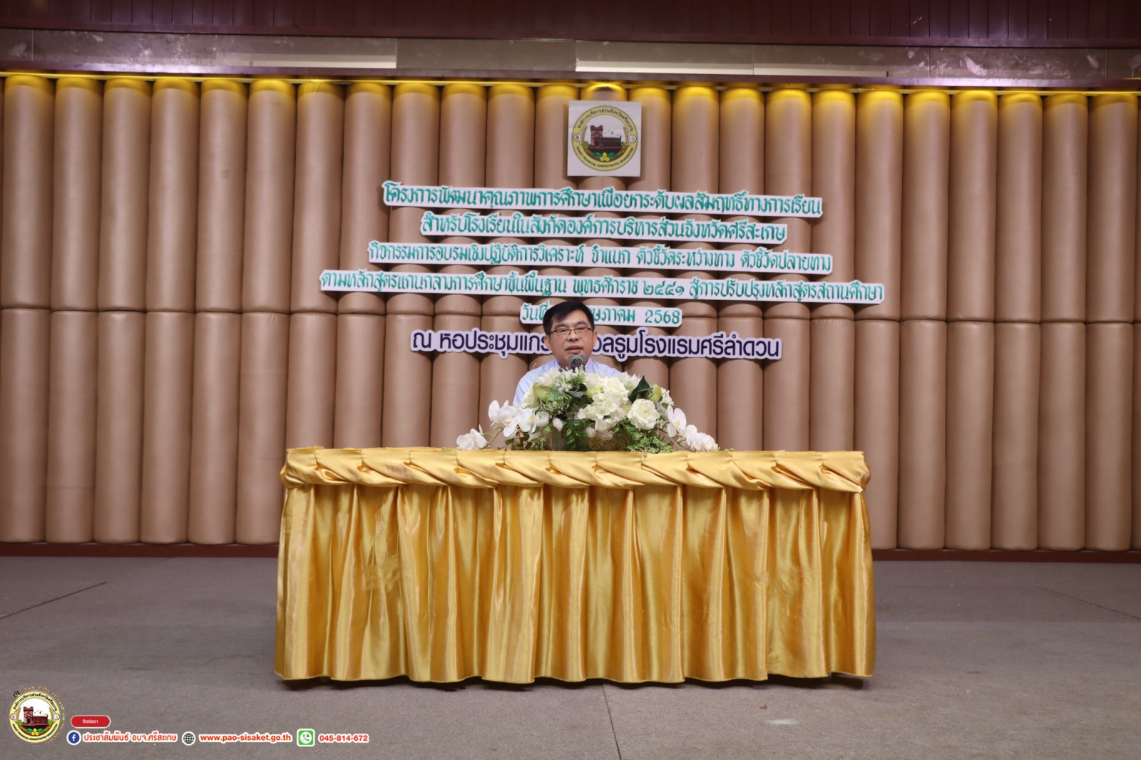 วันที่ 2 พฤษภาคม 2568 ณ โรงแรมศรีลำดวน ต.โพธิ์ อ.เมือง จ.ศรีสะเกษ นายมานะพันธ์ อังคสกุลเกียรติ รองนายก อบจ.ศรีสะเกษ ได้เป็นประธานเปิด อบรมเชิงปฏิบัติการ เรื่อง "การวิเคราะห์และจำแนกตัวชี้วัดระหว่างทาง ตัวชี้วัดปลายทาง ตามหลักสูตรแกนกลางการศึกษาขั้นพื้นฐาน ประจำปี 2568 สู่การปรับปรุงหลักสูตรสถานศึกษา" เพื่อเสริมทักษะให้ผู้บริหารสถานศึกษา ครูและบุคลากรทางการศึกษา ในสังกัด อบจ.ศรีสะเกษ มีความรู้ความเข้าใจเกี่ยวกับโครงสร้างเวลาเรียน โครงสร้างรายระดับชั้นปีของหลักสูตรสถานศึกษา สามารถวิเคราะห์และจำแนกตัวชี้วัดระหว่างทาง ตัวชี้วัดปลายทางได้อย่างถูกต้อง รวมถึงสามารถปรับปรุงหลักสูตรสถานศึกษาของแต่ละโรงเรียน เป็นไปอย่างถูกต้องและเหมาะสมตามบริบทของสถานศึกษา