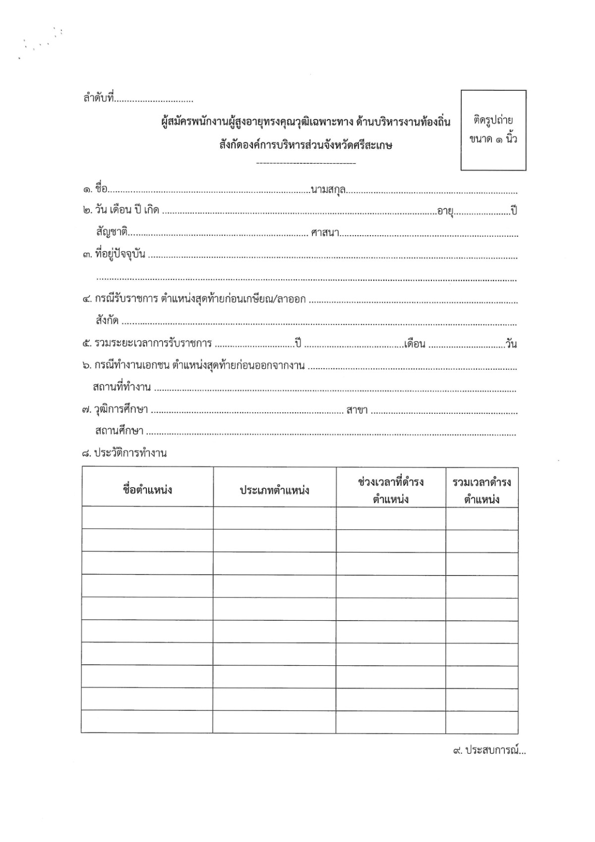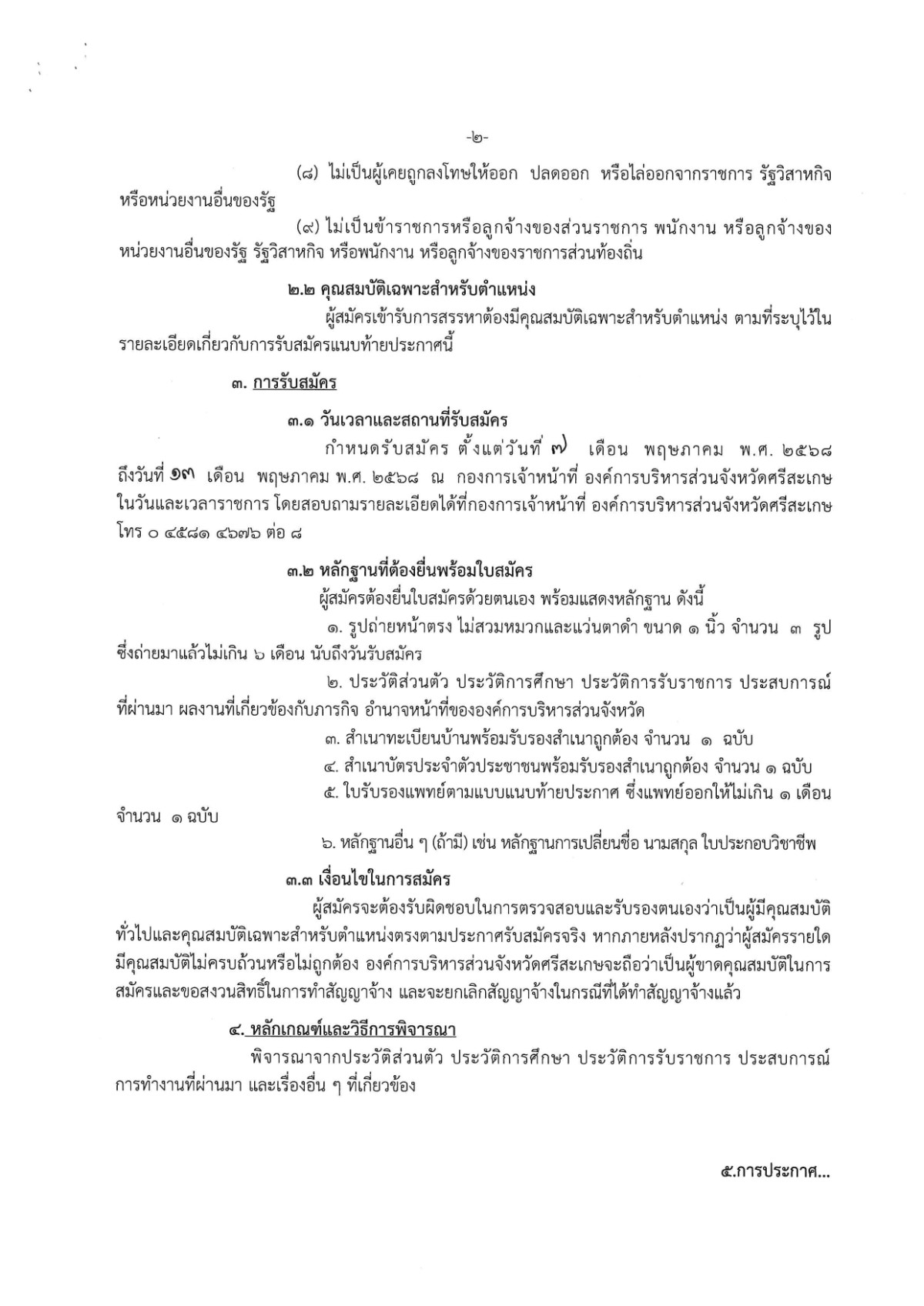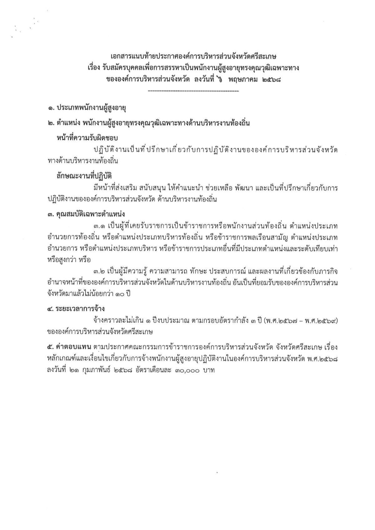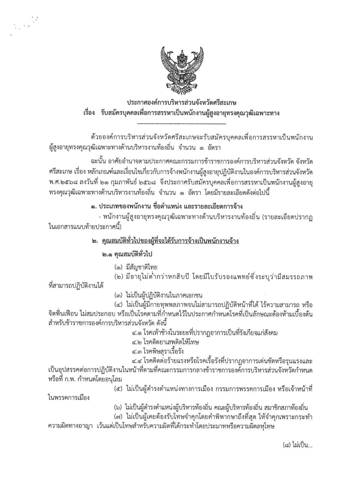 ประกาศองค์การบริหารส่วนจังหวัดศรีสะเกษ เรื่อง รับสมัครบุคคลเพื่อการสรรหาเป็นหนักงานผู้สูงอายุทรงคุณวุฒิเฉพาะทาง