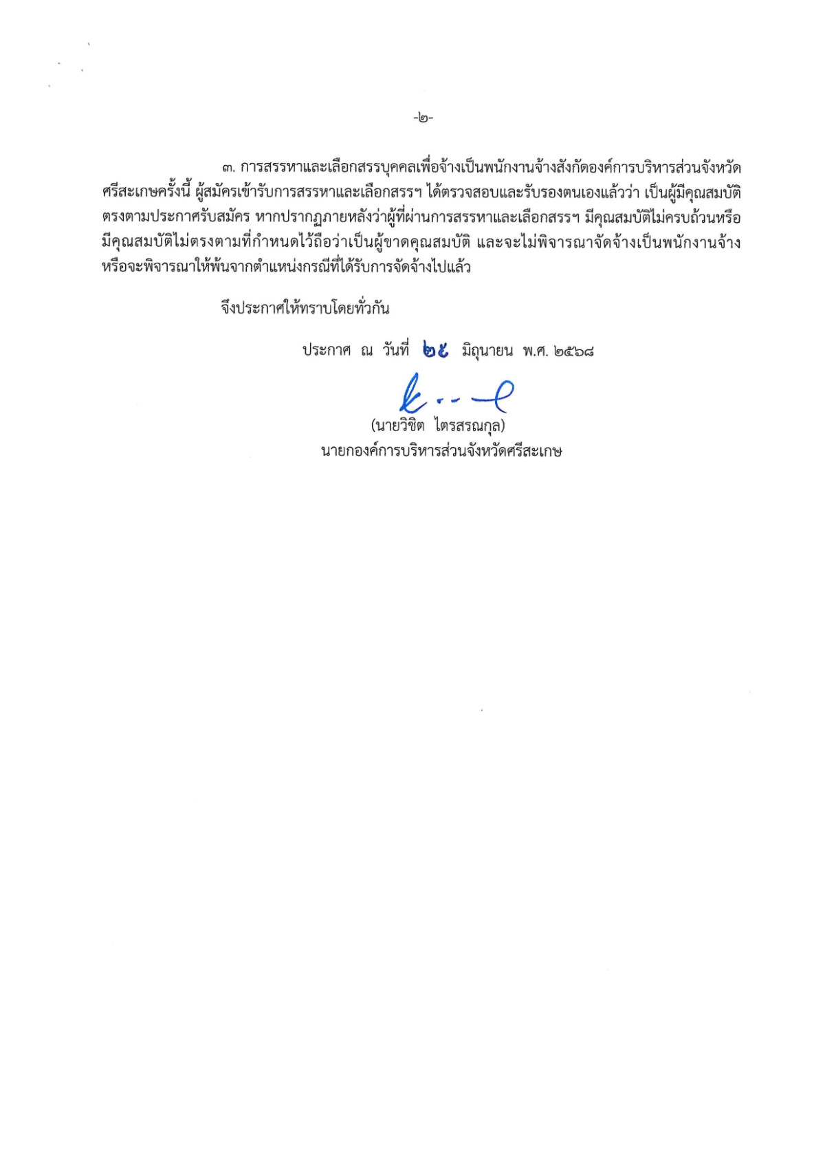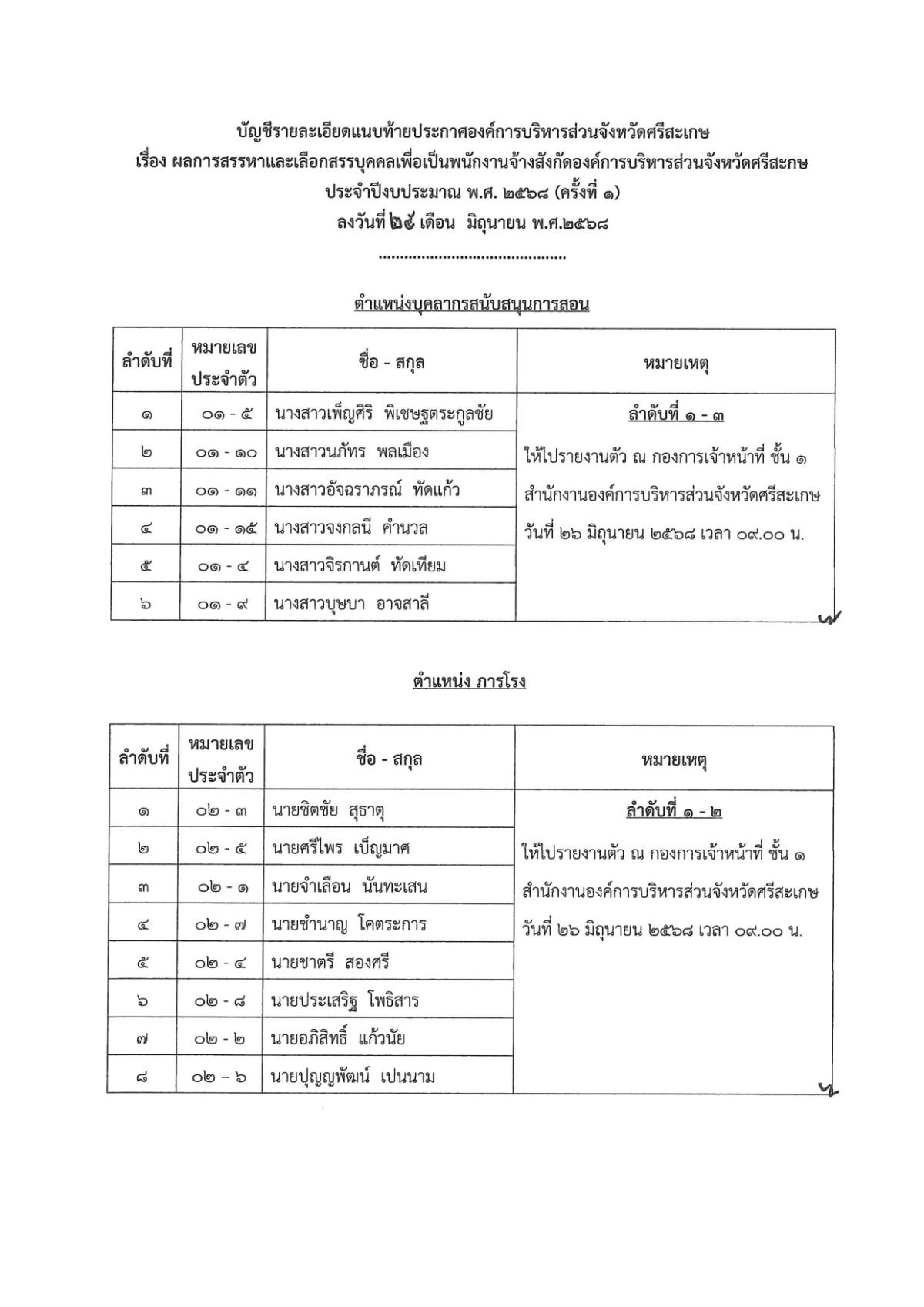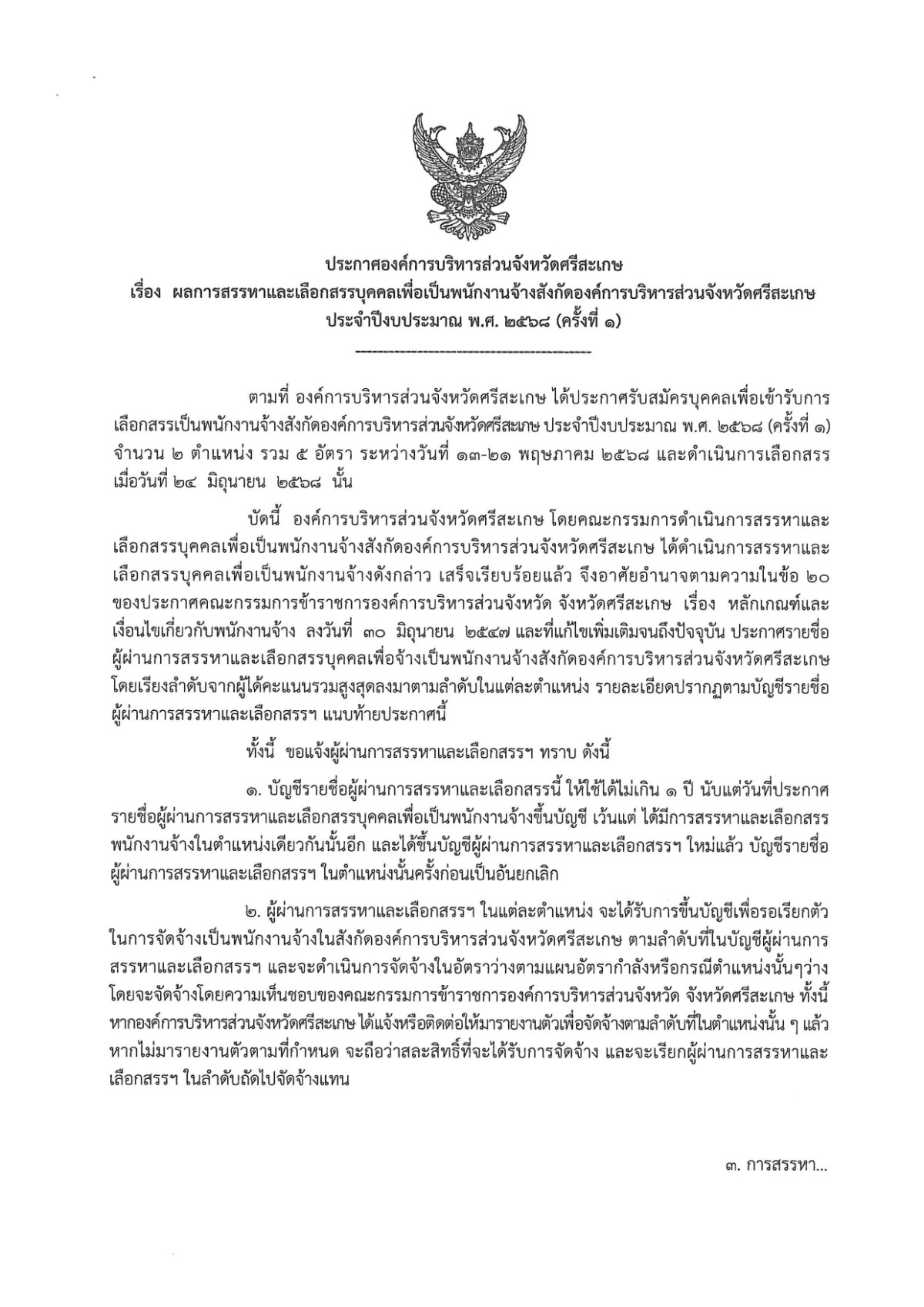 ประกาศองค์การบริหารส่วนจังหวัดศรีสะเกษ เรื่อง ผลการสรรหาและเลือกสรรบุคคลเพื่อเป็นพนักงานจ้างสังกัดองค์การบริหารส่วนจังหวัดศรีสะเกษ ประจำปีงบประมาณ พ.ศ. ๒๕๖๘ (ครั้งที่ ๑)