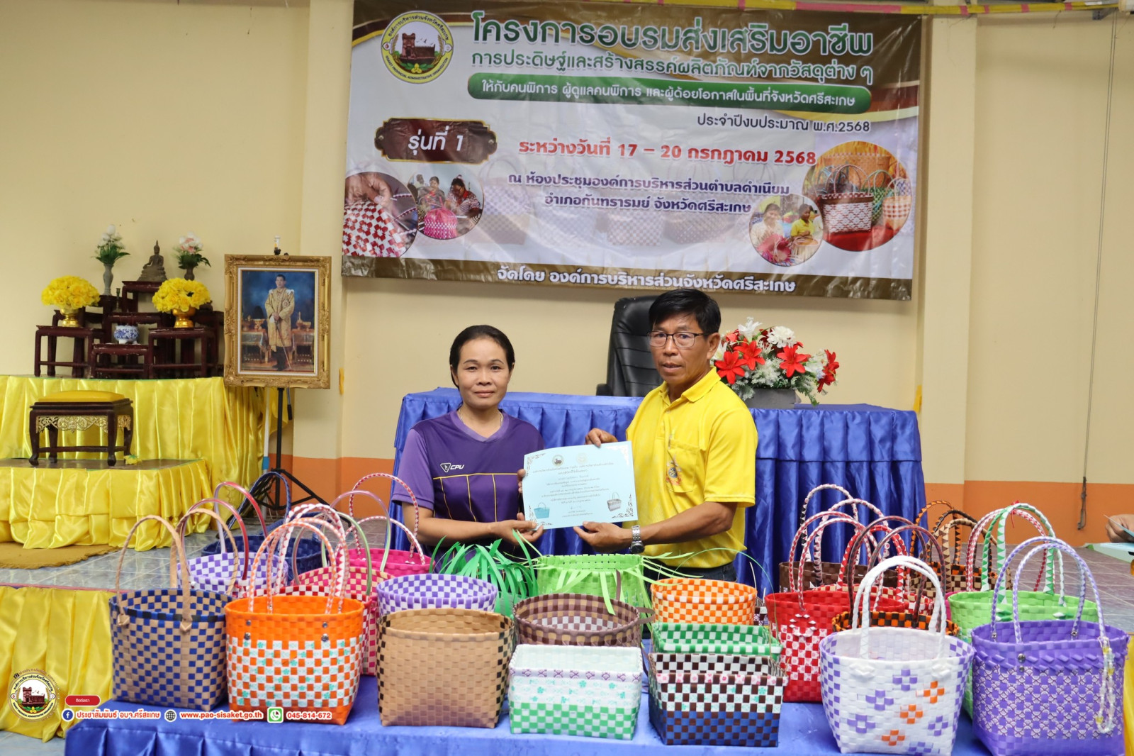 #นายวิชิต_ไตรสรณกุล นายก อบจ.ศรีสะเกษ มอบหมายให้ นายชูชาติ นิลวันดี หัวหน้าฝ่ายสวัสดิการสังคม พร้อมด้วยหัวหน้าส่วนราชการ ข้าราชการ พนักงานสังกัด อบจ.ศรีสะเกษ ปิดโครงการอบรมส่งเสริมอาชีพ การประดิษฐ์และสร้างสรรค์ผลิตภัณฑ์จากวัสดุต่าง ๆ ให้กับ คนพิการ ผู้ดูแลคนพิการ และผู้ด้อยโอกาส ในพื้นที่จังหวัดศรีสะเกษ รุ่นที่ 1 ณ ห้องประชุม อบต.คำเนียม อ.กันทรารมย์ จ.ศรีสะเกษ